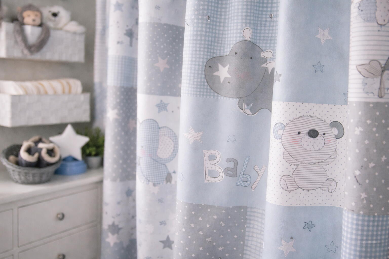 Wat een schitterende kwaliteit gordijnstof! Zien is geloven, zo mooi soepel geweven én maar liefst 280 cm breed! Dat betekent dat het babykamer gordijn meestal naadloos kan worden gemaakt. De schattige dierenprint is gedrukt op een heel fijn geribde stof, wat een vlotte sportieve uitstraling geeft. De baby dierentuin diertjes zijn op de voorzijde gedrukt, in vlakken van 20 x 20 cm groot en leverbaar in 2 verschillende kleurcombinaties. Eigentijds zacht blauw met fris grijs voor de jongenskamer en pastel roze met vergrijsd camel voor meisjeskamer. Door de royale print kun je het gordijn uitstekend tot de grond laten confectioneren. Wanneer je extra verduistering wenst, graag optie voeren aanvinken in het bestelproces. Kortom, deze fraaie stofserie is een aanwinst binnen onze enorme collectie.