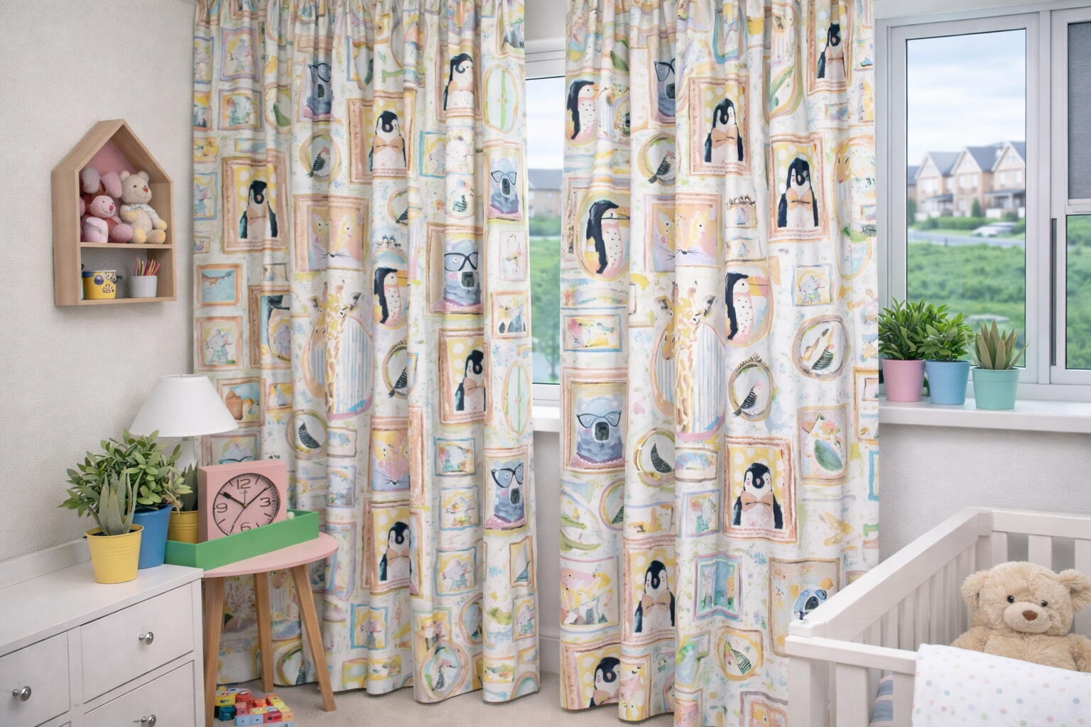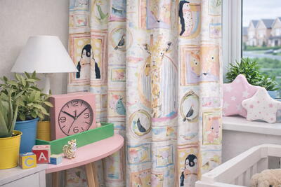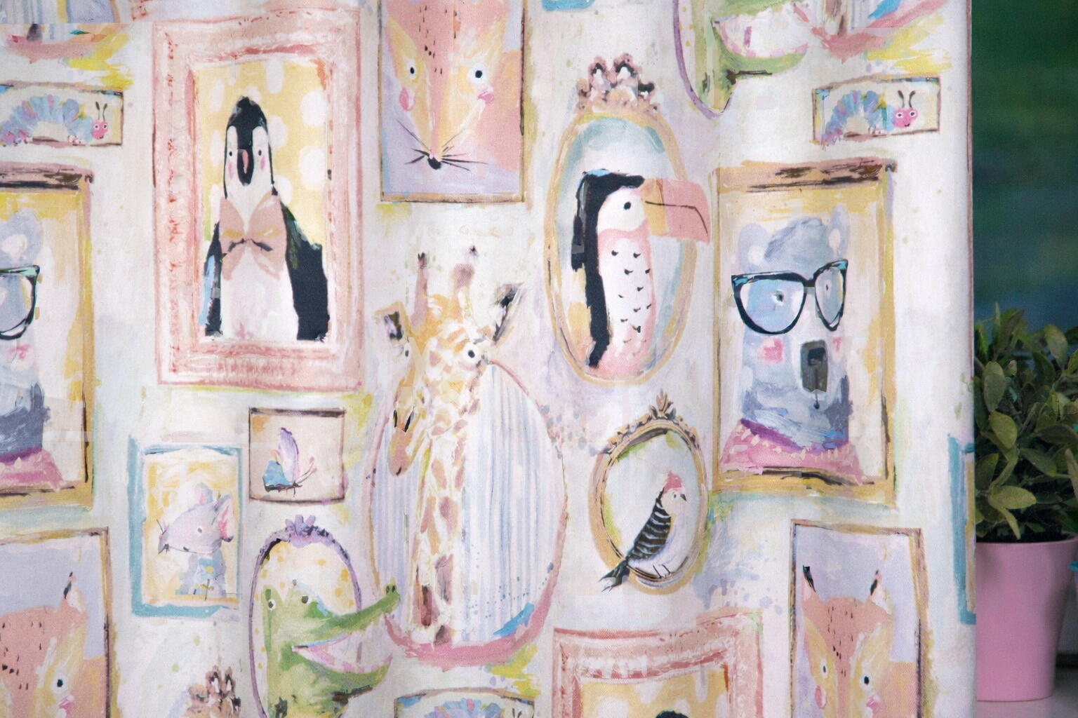 In het motief komen onder andere een pinguïn met strik, een nieuwsgierige giraf, een beer met bril, een vos, een vogel en andere dierenvriendjes terug. De lijsten verschillen subtiel van vorm en formaat – ovaal, rechthoekig of speels afgerond – wat zorgt voor een levendig en afwisselend beeld. Sommige kaders zijn royaal opgezet: zo meet de beer bijvoorbeeld circa 18 x 18 cm, waardoor de dieren goed zichtbaar blijven, ook wanneer het gordijn geplooid hangt.