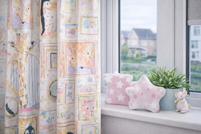 Ahhh, een ingelijste blikvanger – dat is Framed Animals in één oogopslag. Dit kindergordijn laat een vrolijke verzameling dieren zien, ieder geportretteerd in zijn eigen lijst, alsof je naar een wand vol schilderijtjes kijkt. De illustraties zijn uitgevoerd met een losse, vlotte penseeltechniek, waardoor het geheel een handgeschilderd karakter krijgt en nooit strak of stijf oogt.