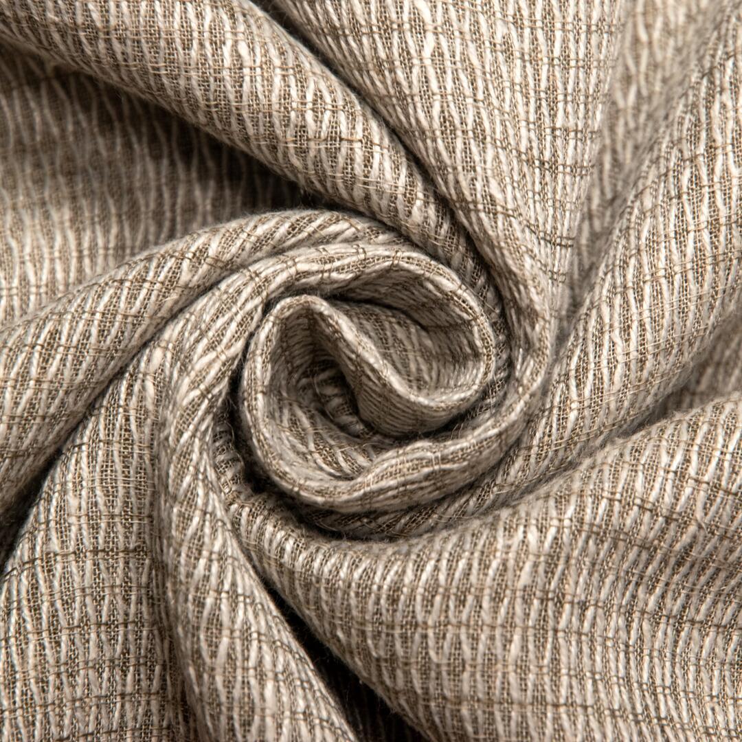 Gandi is een kamerhoog gordijn met een verfijnde, grafische weefstructuur die direct zichtbaar is in de stof zelf – geen print, maar een patroon dat ontstaat door het weven. In de stof is een regelmatig herhaald motief te zien van smalle, verticale V-vormige schakeringen die samen een rustig ritme vormen over het gehele oppervlak. Dit patroon is subtiel, maar duidelijk aanwezig en geeft het doek een mooie dieptewerking zodra het licht erop valt. De structuur is één van de sterke punten van Gandi. Het doek is opgebouwd uit fijne, strak geweven draden die samen een gelijkmatig raster vormen. Daaroverheen lopen iets dikkere inslagdraden die het V-patroon creëren. Hierdoor ontstaat een licht reliëf en een zachte schaduwwerking in het oppervlak. De stof voelt textielachtig en stevig aan, maar blijft tegelijk lichtdoorlatend en soepel in de plooi. Wanneer daglicht door het gordijn valt, wordt het licht zacht gefilterd. Het patroon blijft zichtbaar, wat de ruimte een gelaagde uitstraling geeft zonder het zicht volledig te blokkeren. Daardoor is Gandi zeer geschikt voor woonkamers, eetkamers en grote raampartijen waar een goede balans tussen privacy en licht gewenst is. Doordat de stof kamerhoog wordt geleverd, loopt het gordijn uit één stuk van plafond tot vloer. In combinatie met bijvoorbeeld een vlinder, of een rustige wave-plooi komt het verticale patroon extra goed tot zijn recht en wordt de hoogtewerking van de ruimte versterkt. Gandi is verkrijgbaar in zes zorgvuldig gekozen tinten, elk met een eigen karakter: