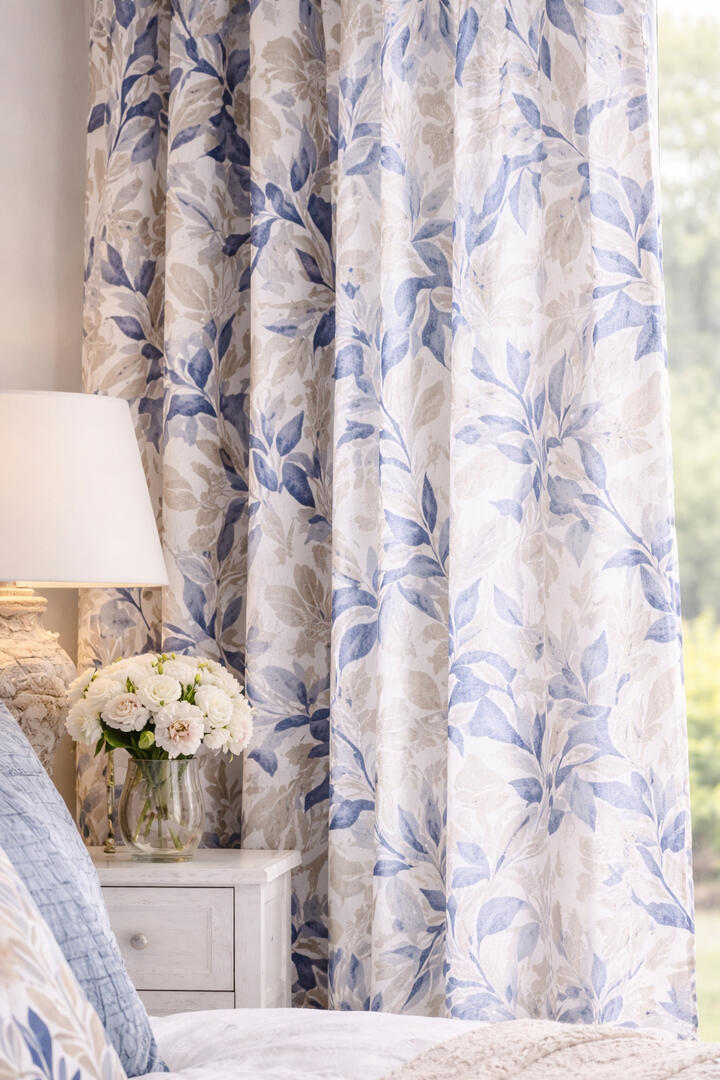 De bladeren variëren van smalle, gestileerde vormen tot iets bredere accenten, waardoor het dessin een natuurlijke dynamiek krijgt. Sommige elementen zijn duidelijk omlijnd, terwijl andere juist een meer penseelachtige invulling hebben. Dit contrast geeft het gordijn karakter zonder overheersend te worden. Door de manier waarop het patroon over de plooien valt, blijft het dessin ook bij een rijk geplooid gordijn goed herkenbaar.