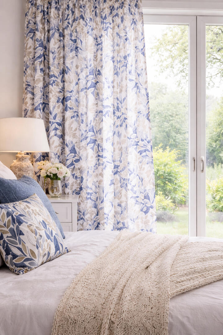 De stof heeft een fijne, licht open geweven structuur die typerend is voor een inbetween kwaliteit. Hierdoor valt het gordijn soepel en ontstaan er volle, zachte plooien. Het materiaal laat daglicht op een prettige manier door, waardoor de ruimte licht blijft terwijl inkijk wordt verminderd. De print is gelijkmatig en scherp op de stof aangebracht, waarbij de subtiele textuur van het weefsel zichtbaar blijft en bijdraagt aan de uitstraling.