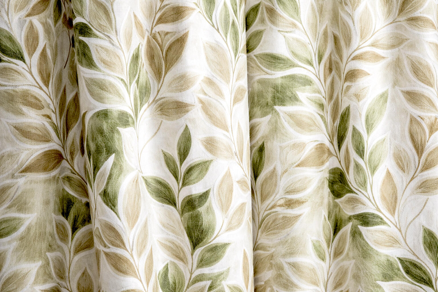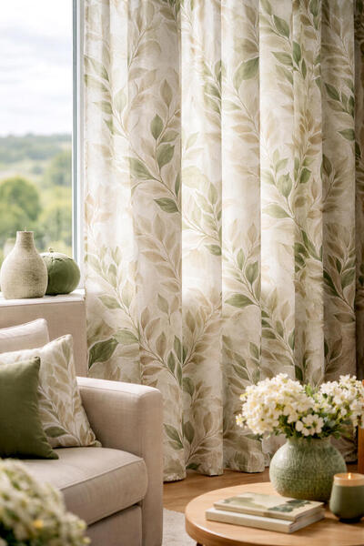 De bladeren variëren van smalle, gestileerde vormen tot iets bredere accenten, waardoor het dessin een natuurlijke dynamiek krijgt. Sommige elementen zijn duidelijk omlijnd, terwijl andere juist een meer penseelachtige invulling hebben. Dit contrast geeft het gordijn karakter zonder overheersend te worden. Door de manier waarop het patroon over de plooien valt, blijft het dessin ook bij een rijk geplooid gordijn goed herkenbaar.