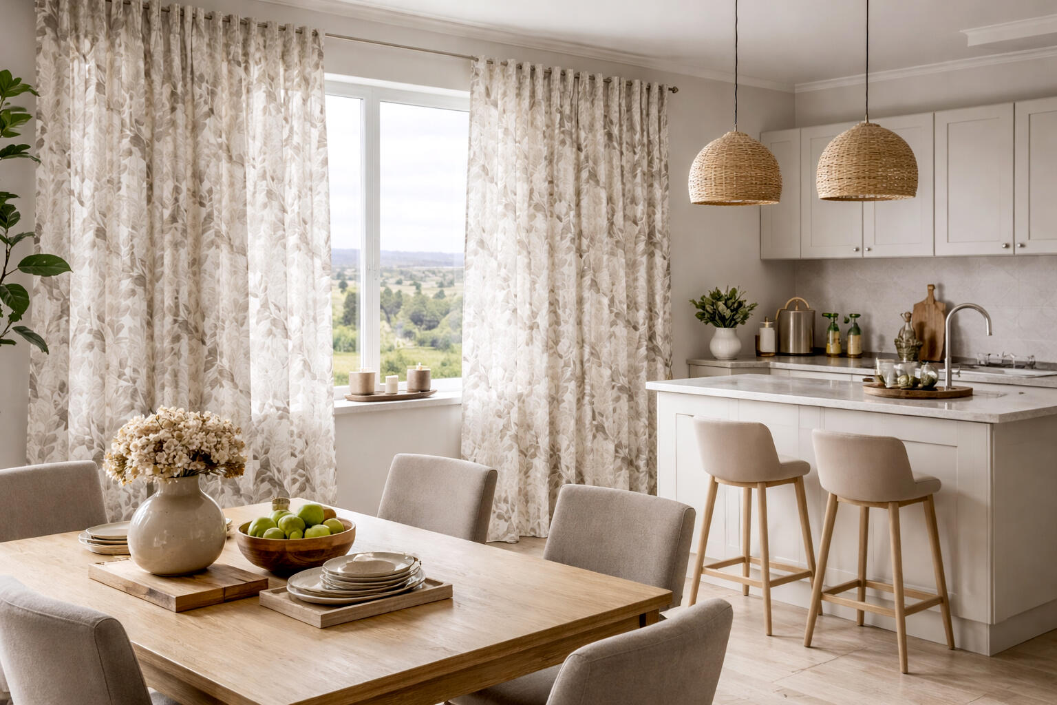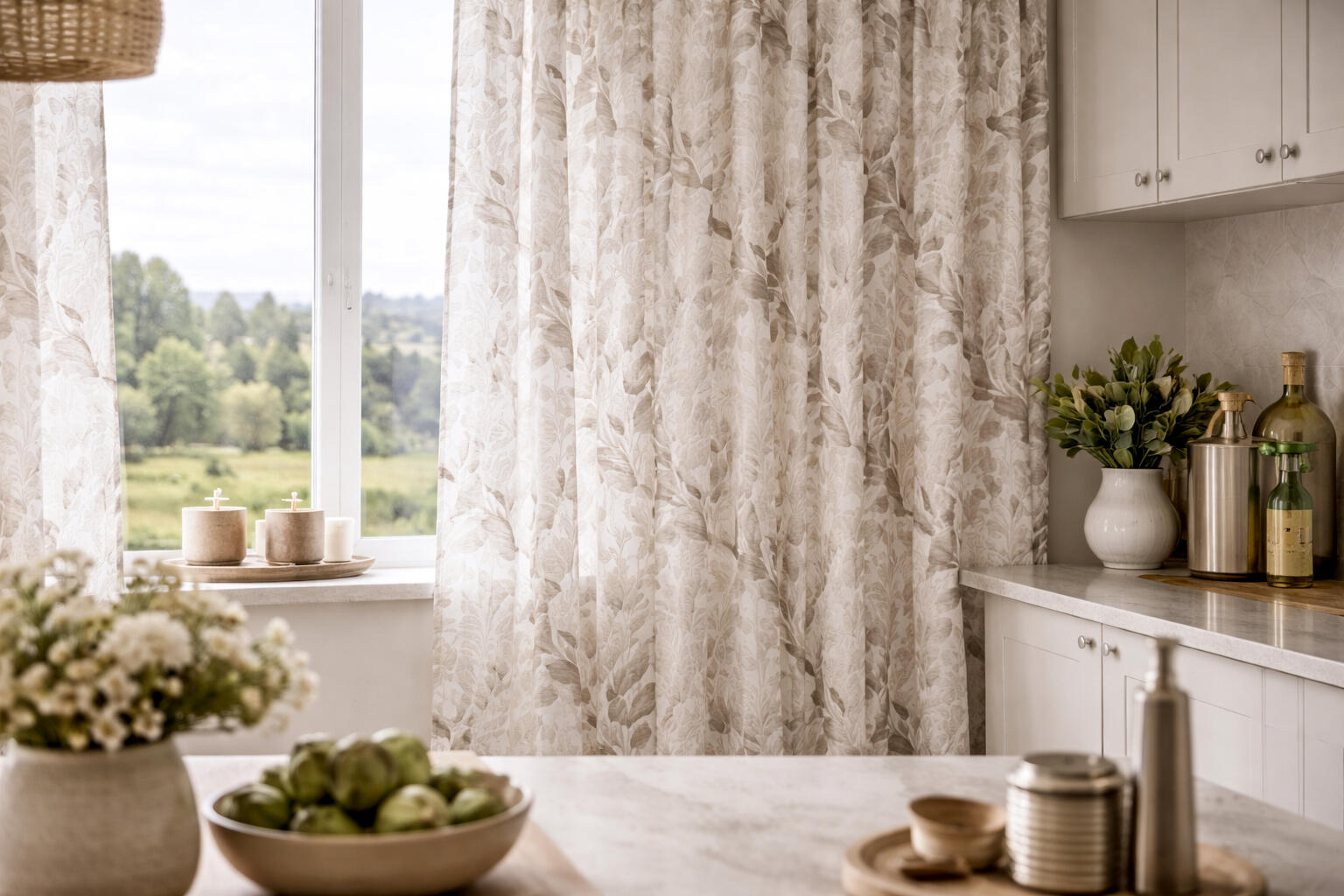 De stof heeft een fijne, licht open geweven structuur die typerend is voor een inbetween kwaliteit. Hierdoor valt het gordijn soepel en ontstaan er volle, zachte plooien. Het materiaal laat daglicht op een prettige manier door, waardoor de ruimte licht blijft terwijl inkijk wordt verminderd. De print is gelijkmatig en scherp op de stof aangebracht, waarbij de subtiele textuur van het weefsel zichtbaar blijft en bijdraagt aan de uitstraling.