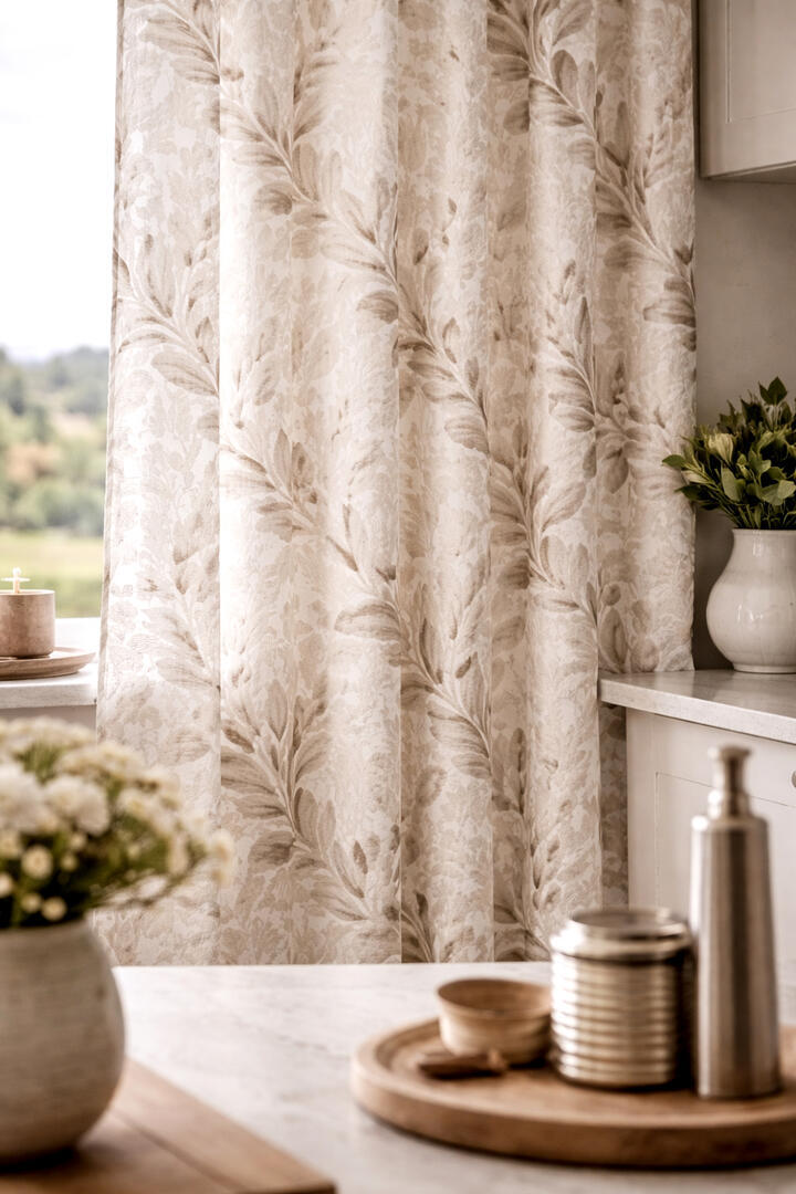 De bladeren variëren van smalle, gestileerde vormen tot iets bredere accenten, waardoor het dessin een natuurlijke dynamiek krijgt. Sommige elementen zijn duidelijk omlijnd, terwijl andere juist een meer penseelachtige invulling hebben. Dit contrast geeft het gordijn karakter zonder overheersend te worden. Door de manier waarop het patroon over de plooien valt, blijft het dessin ook bij een rijk geplooid gordijn goed herkenbaar.