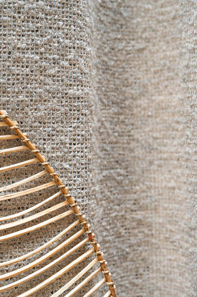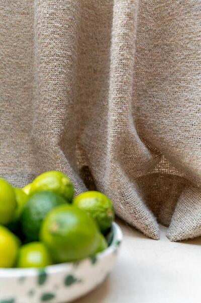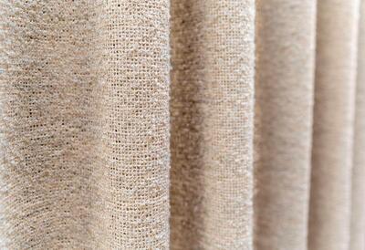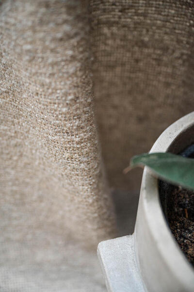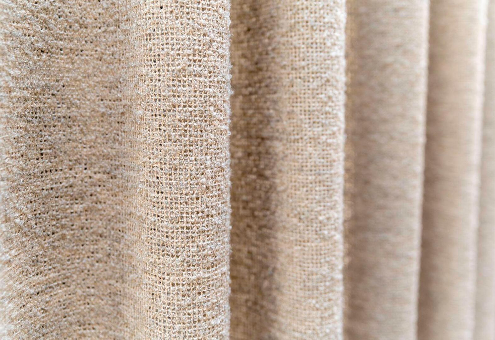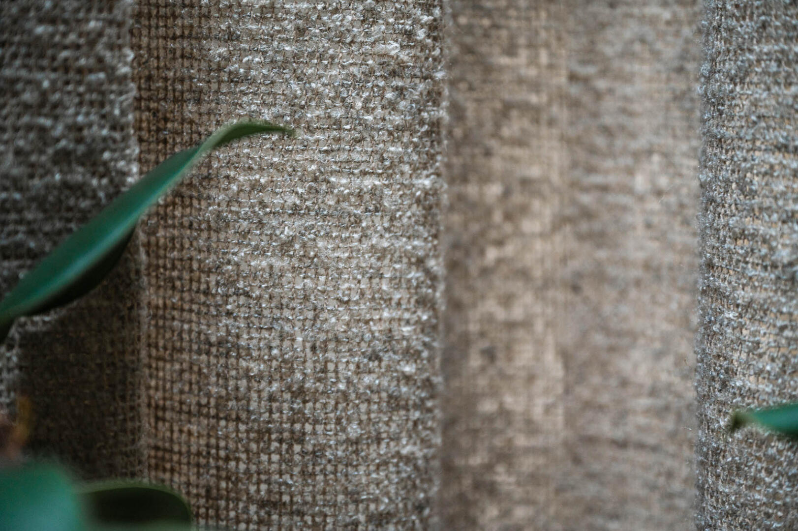 Cocoon is een in-between gordijnstof die opvalt door zijn rijke, wollige oppervlak. De stof krijgt zijn karakter door het gebruik van bouclé garen in de kettingdraad, gecombineerd met een natuurlijk ogend garen in de inslag. Deze opbouw zorgt voor een duidelijke, maar rustige textuur waarin kleine lusjes, ongelijkheden en verdikkingen samen een warme uitstraling geven. Op de foto is goed te zien hoe de stof een open mesh-structuur heeft, opgebouwd uit kleine vierkante openingen die ritmisch terugkomen over het hele oppervlak. De bouclé draden liggen hier als een zachte, onregelmatige laag overheen, waardoor de stof niet vlak oogt maar juist vol en aangenaam zacht. Het motief is niet strak of regelmatig; juist de subtiele variatie in dikte en hoogte van de garens zorgt voor een natuurlijke, levendige indruk. De kleur toont zich als een lichte, warme zandtint met een subtiele mix van beige en gebroken wit. Door de manier waarop het licht door de open structuur speelt, lijkt de tint soms wat lichter en soms wat dieper. In de plooien ontstaat een speels contrast: de verhoogde delen van het bouclé garen lijken iets donkerder, terwijl de open mesh-vlakken juist zachter en luchtiger overkomen. Cocoon is ideaal voor wie op zoek is naar een gordijn dat warmte en comfort toevoegt aan een interieur zonder overheersend te zijn. De structuur werkt uitnodigend en geeft een ruimte direct een fijn, huiselijk gevoel.