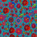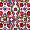 De kleuren zijn uitgesproken en vrolijk: warme tinten rood, roze en oranje worden gecombineerd met accenten in geel, paars en fris groen. Tussen de grotere bloemvormen en ronde motieven zorgen kleinere elementen voor afwisseling, waardoor het geheel blijft boeien zonder onrustig te worden. De balans tussen het fijne lijnenspel en de vollere vormen geeft het dessin diepte en ritme.