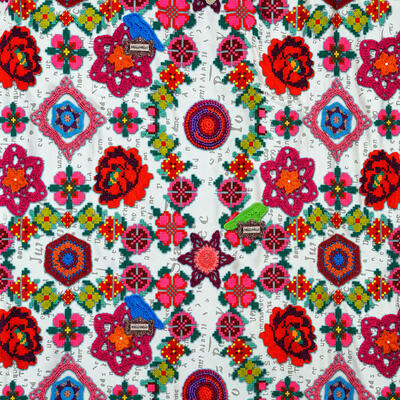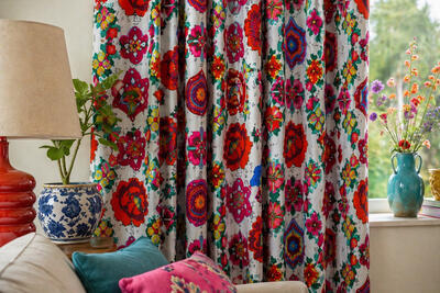 Het gordijn Crochet Mosaic valt op door een rijk en speels motief waarin verschillende handwerkinvloeden samenkomen. Over de lichte ondergrond ontvouwt zich een levendige compositie van kleurrijke bloemen, geometrische vormen en cirkelvormige patronen die doen denken aan gehaakte rozetten. De details lijken opgebouwd uit kleine steken en structuren, alsof elk element met zorg is samengesteld. Dit geeft de stof een gelaagd en bijna tastbaar effect.