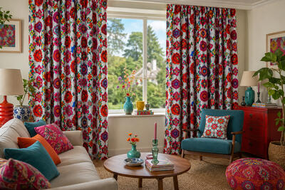 De structuur van de print wekt de indruk van handwerk, met subtiele variaties die lijken op gehaakte en geborduurde details. Hierdoor krijgt het gordijn een ambachtelijk karakter dat goed past in zowel een kleurrijk interieur als een ruimte waar één uitgesproken element de aandacht mag trekken.