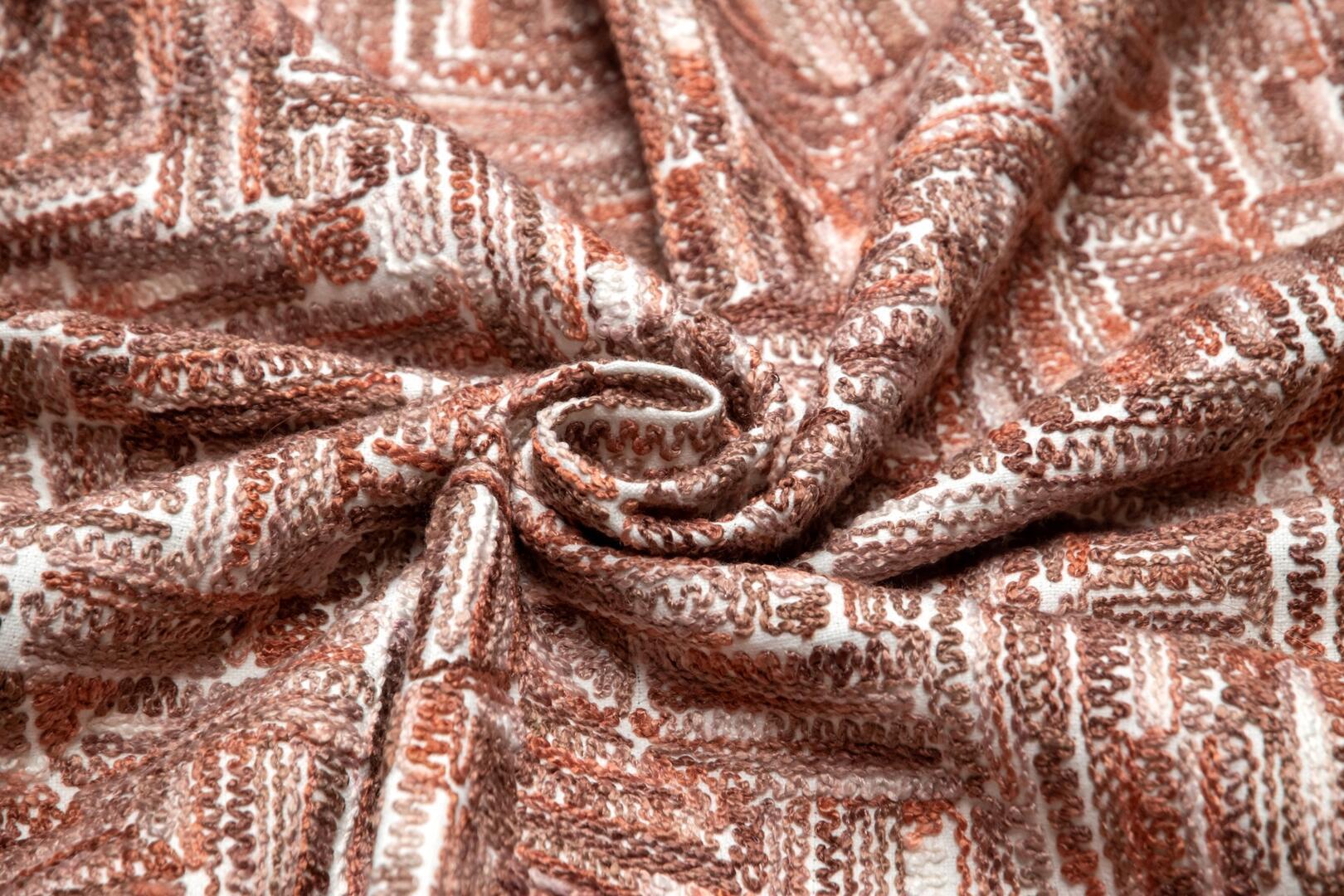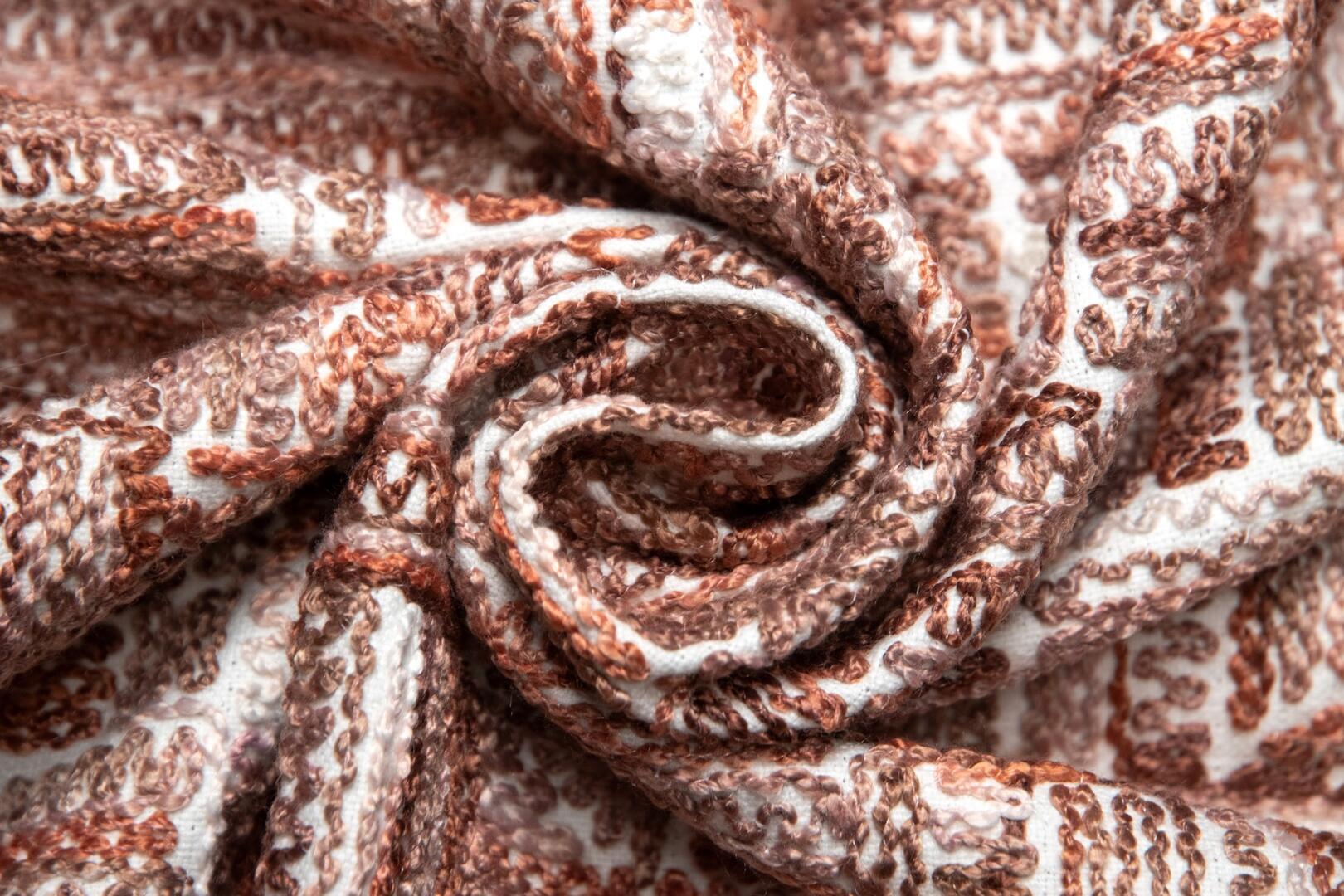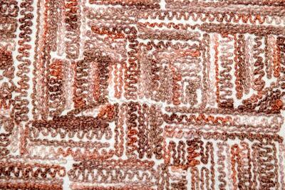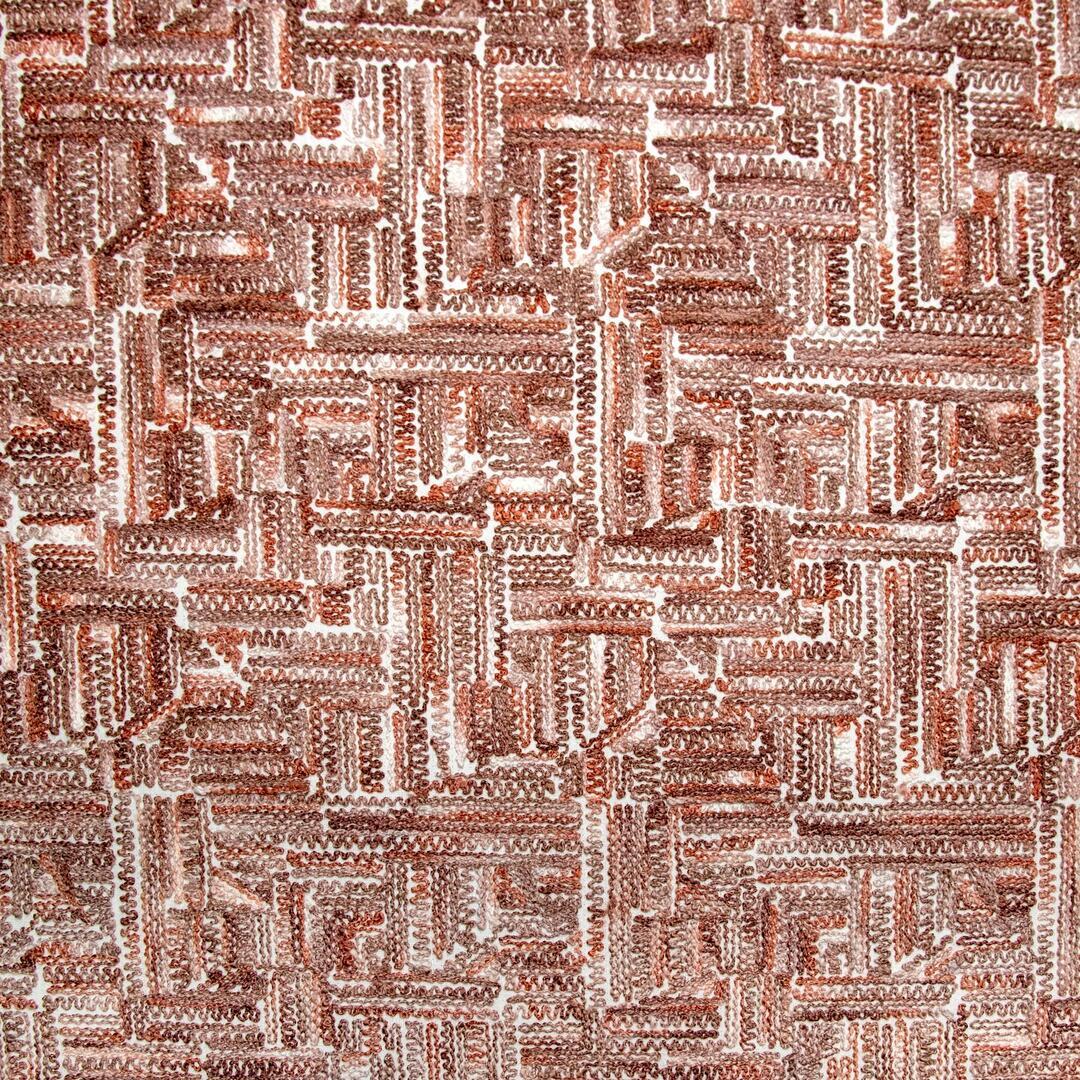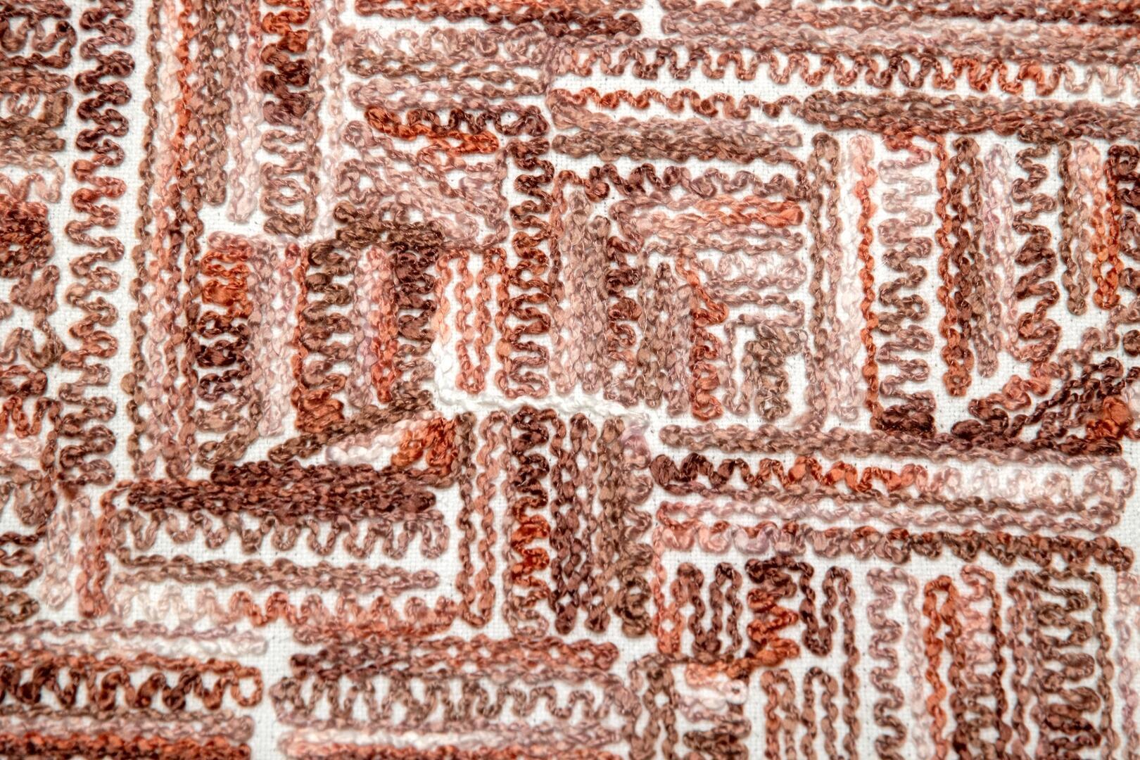 Wat deze stof zo onderscheidt, is de manier waarop het motief tot stand komt. De draden zijn niet simpelweg gedrukt of bedrukt, maar nauwgezet in het weefsel geïntegreerd. Dit levert een voelbaar reliëf op, waarin lichte en schaduwpartijen ontstaan naarmate het licht over het oppervlak strijkt. Het patroon toont een onregelmatige geometrische structuur: een combinatie van rechte lijnen en subtiel gebogen segmenten die ritme geven aan het geheel. Het lijkt alsof het weefsel zelf een grafische sculptuur is, die bij elk standpunt een andere indruk maakt.