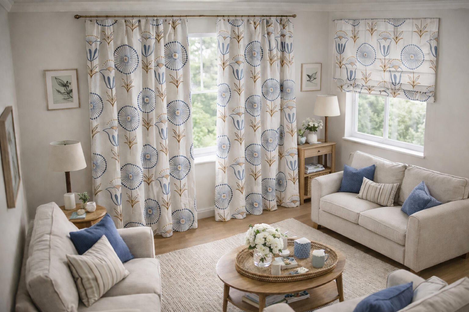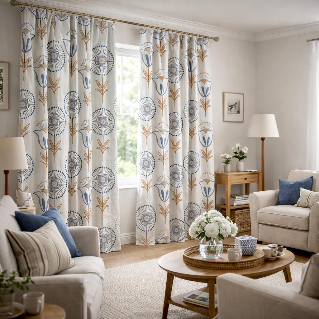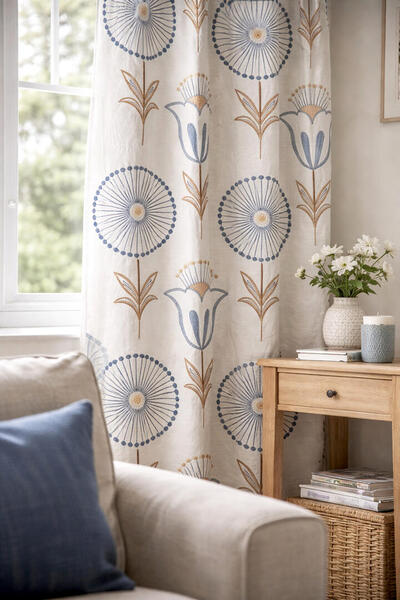 Dankzij het repeterende patroon komt Fiorella zowel in een enkele baan als in een bredere raampartij volledig tot zijn recht. De verticale plaatsing van de stelen benadrukt de hoogte van de ruimte, terwijl de ronde bloemvormen zorgen voor een speels en evenwichtig beeld.