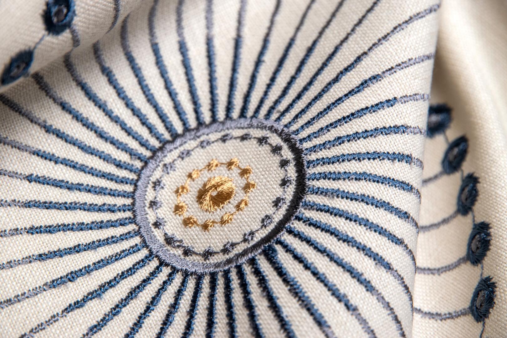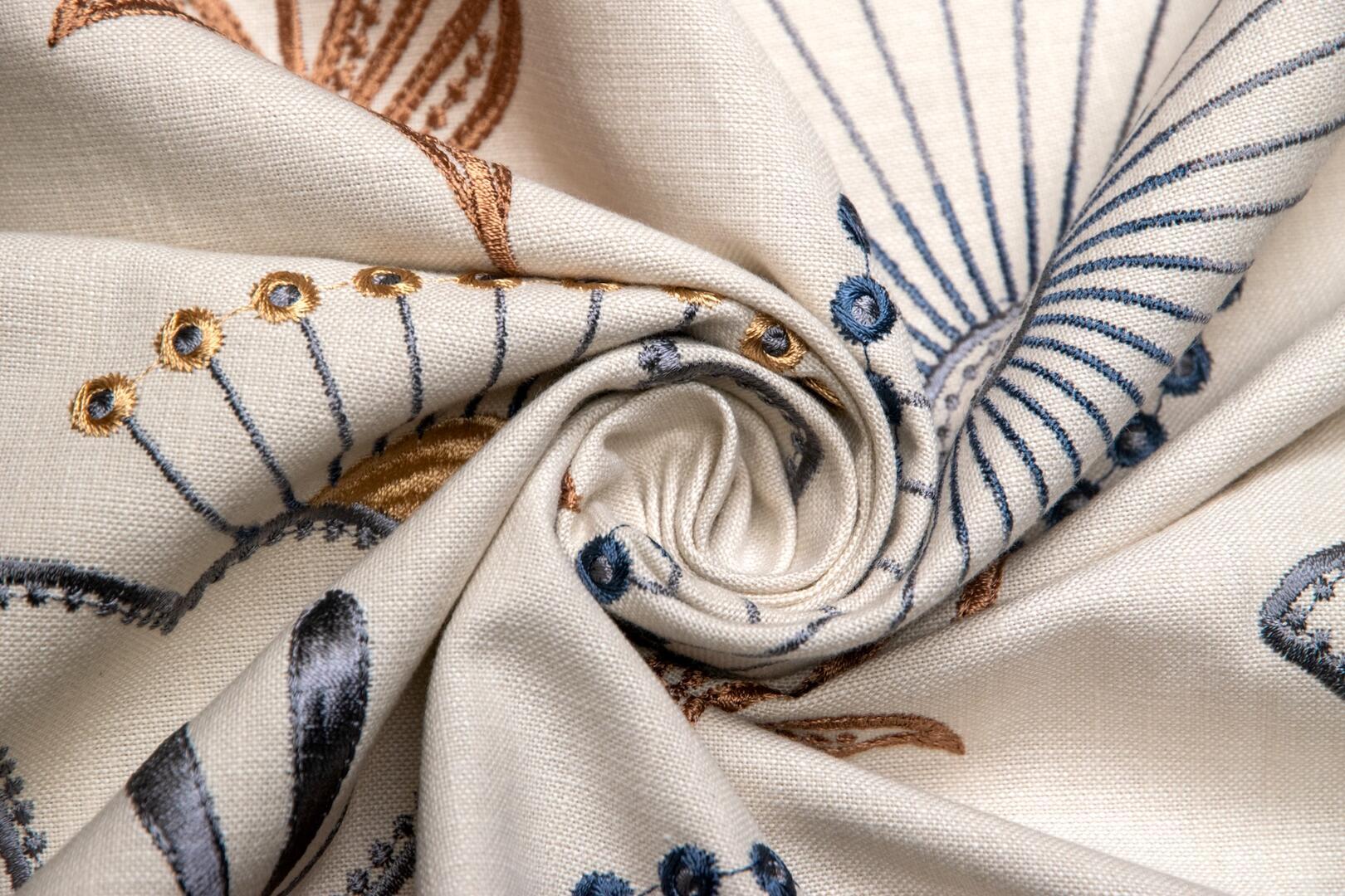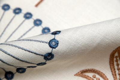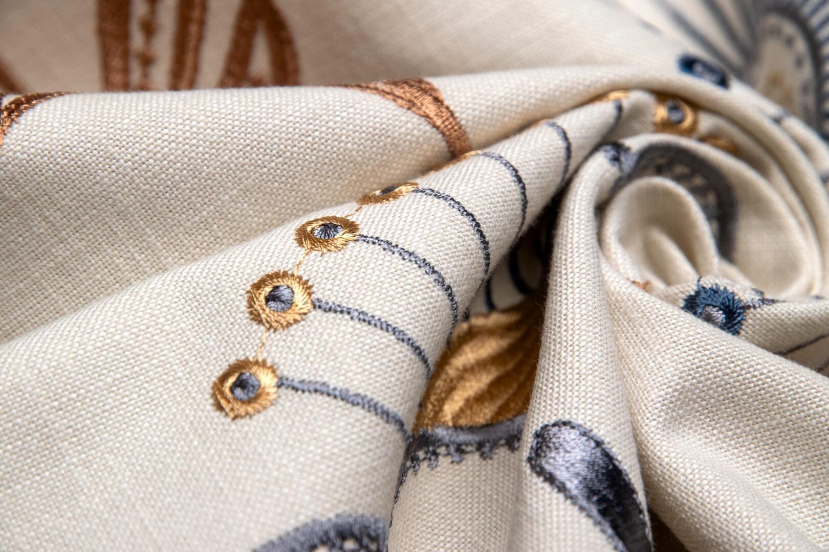Wat Fiorella bijzonder maakt, is de zichtbare borduurstructuur. Het motief ligt voelbaar op de stof en geeft het gordijn een rijke textuur. De steken variëren van dicht op elkaar geplaatste vullingen tot fijne lijnsteken en subtiele bolletjes die als kleine parels op het doek liggen. De ondergrond heeft een licht linnenachtige uitstraling, waardoor het borduurwerk extra tot zijn recht komt. Wanneer het licht erop valt, ontstaat er een mooi spel tussen mat garen en de zachte basisstof.