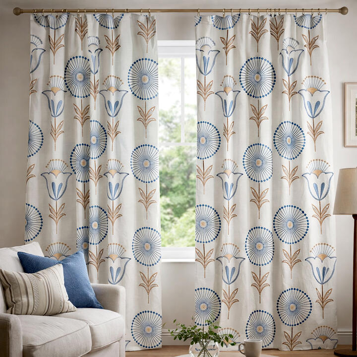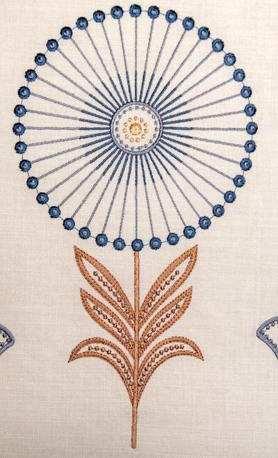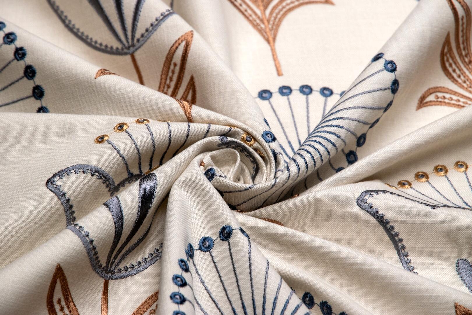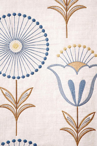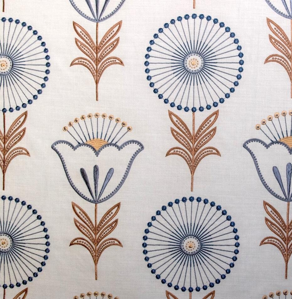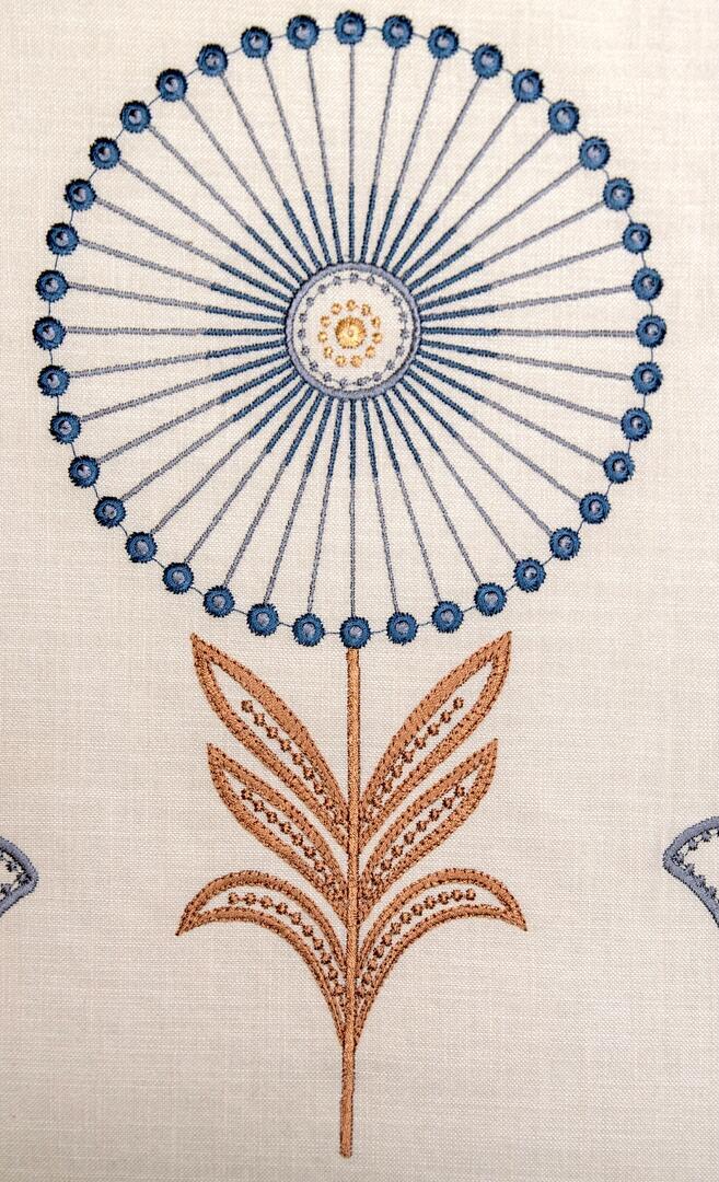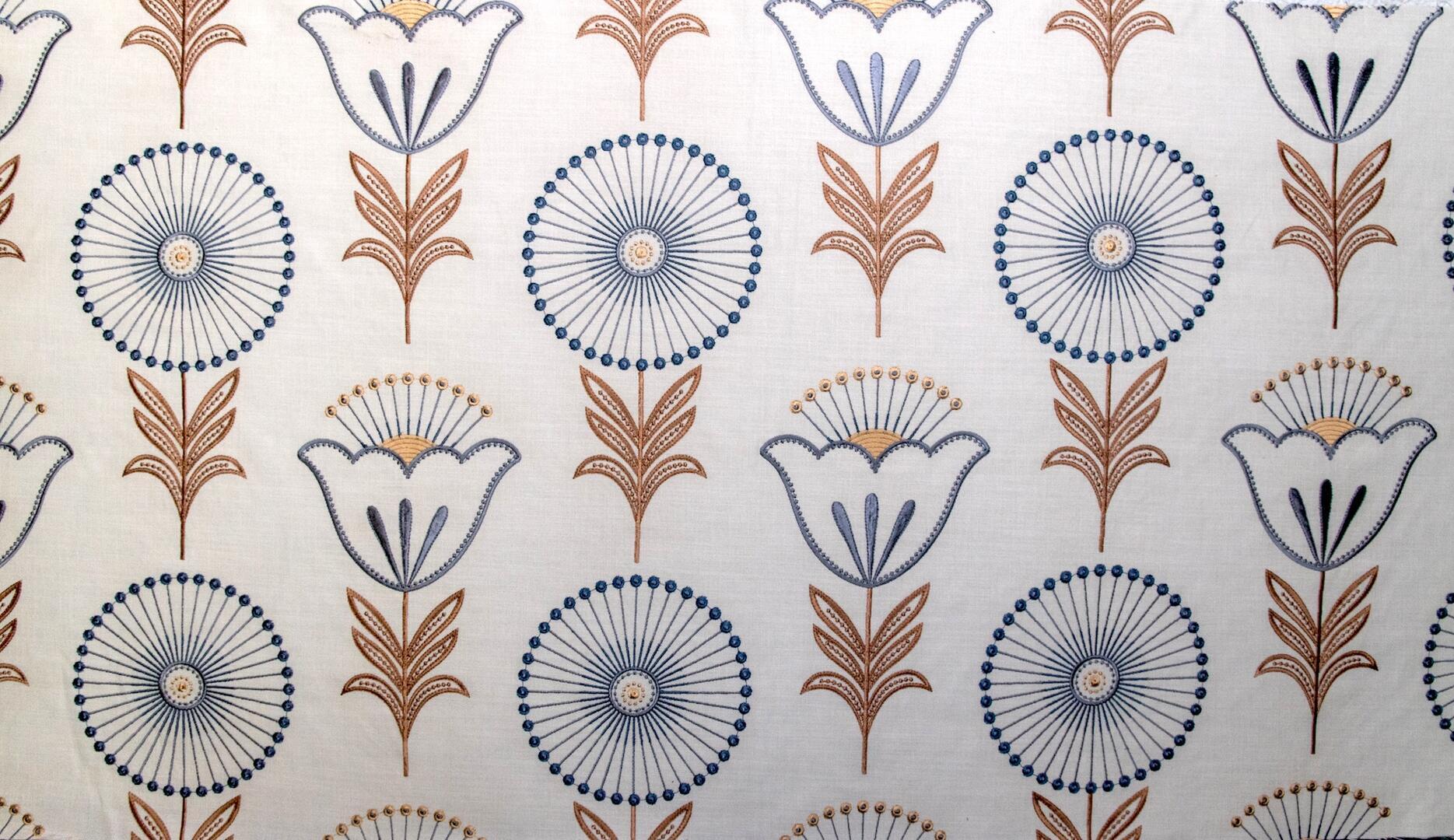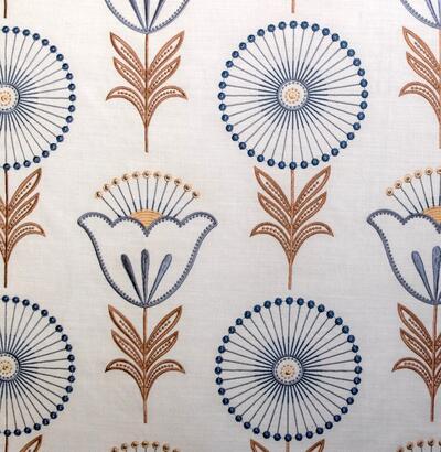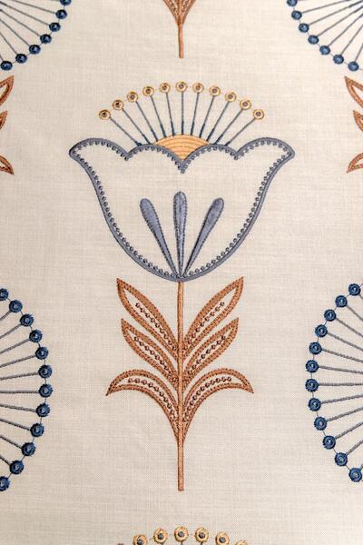 Fiorella is een rijk geborduurd gordijn met een uitgesproken, karaktervol motief dat direct in het oog springt. Op een zachte, naturel ondergrond ontvouwt zich een ritmisch patroon van gestileerde bloemen en ranke stelen. Het ontwerp combineert ronde bloemvormen met fijne, straalsgewijs geplaatste lijnen en subtiele knoopdetails, afgewisseld met tulpachtige bloemelementen en symmetrische bladranken.