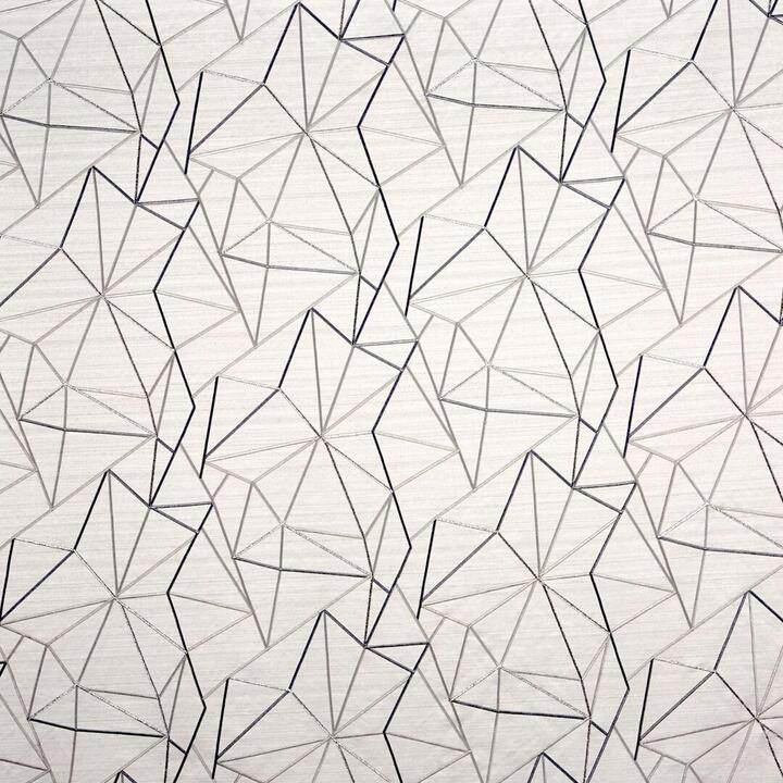 Dit bijzondere overgordijn kenmerkt zich door een verfijnd patroon van geometrische lijnen, geborduurd met diverse garens, waaronder glanzende en matte tinten, afgestemd op kleur. Het productieproces is intensief en tijdrovend, doordat de draden van het patroon met tal van naalden wordt ingestikt blijft deze stof geheel exclusief en uniek.
