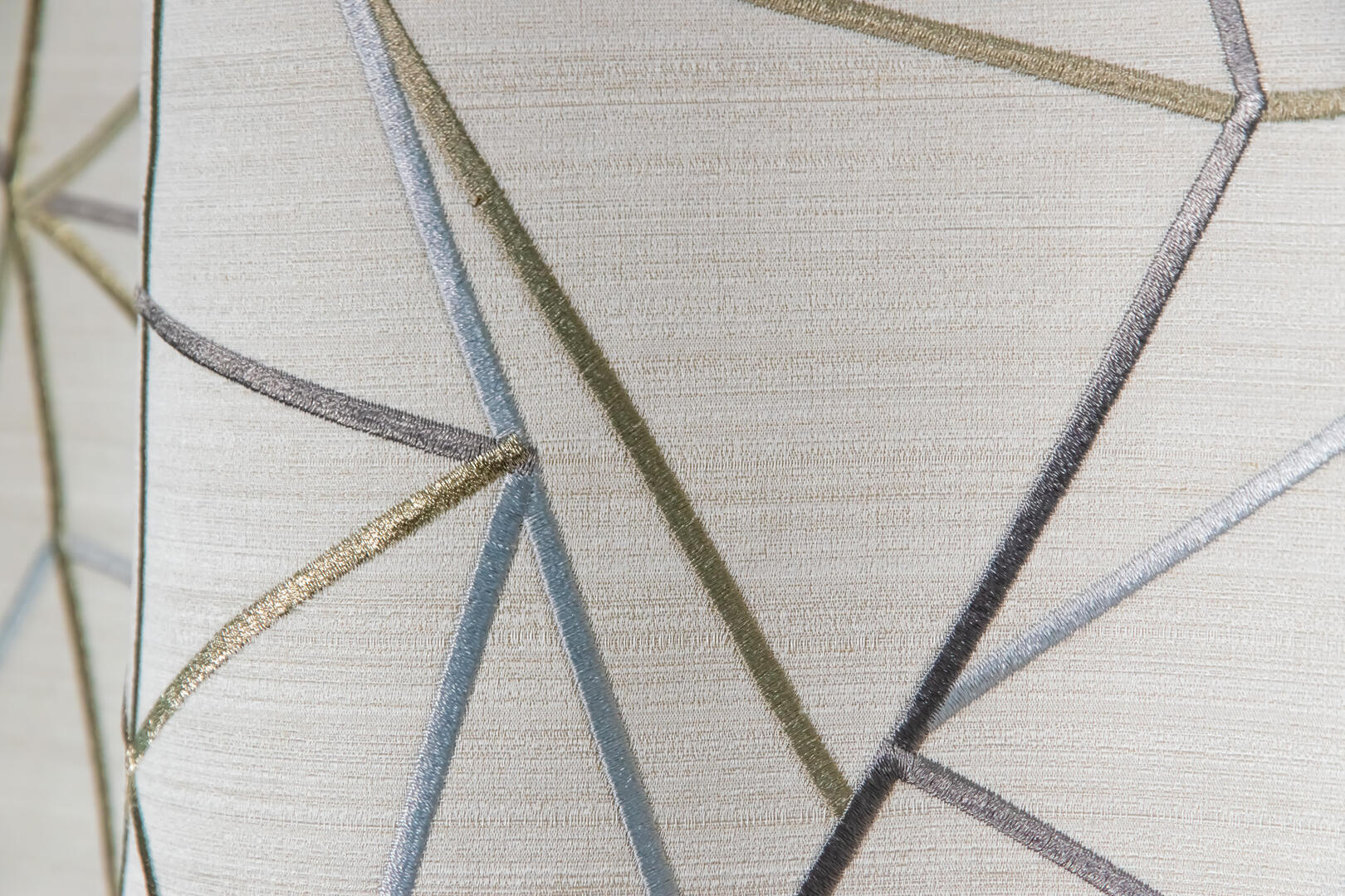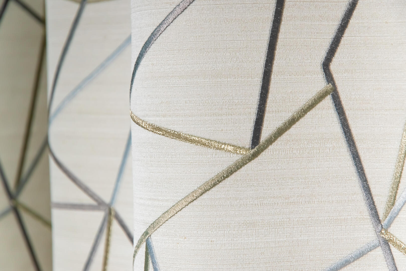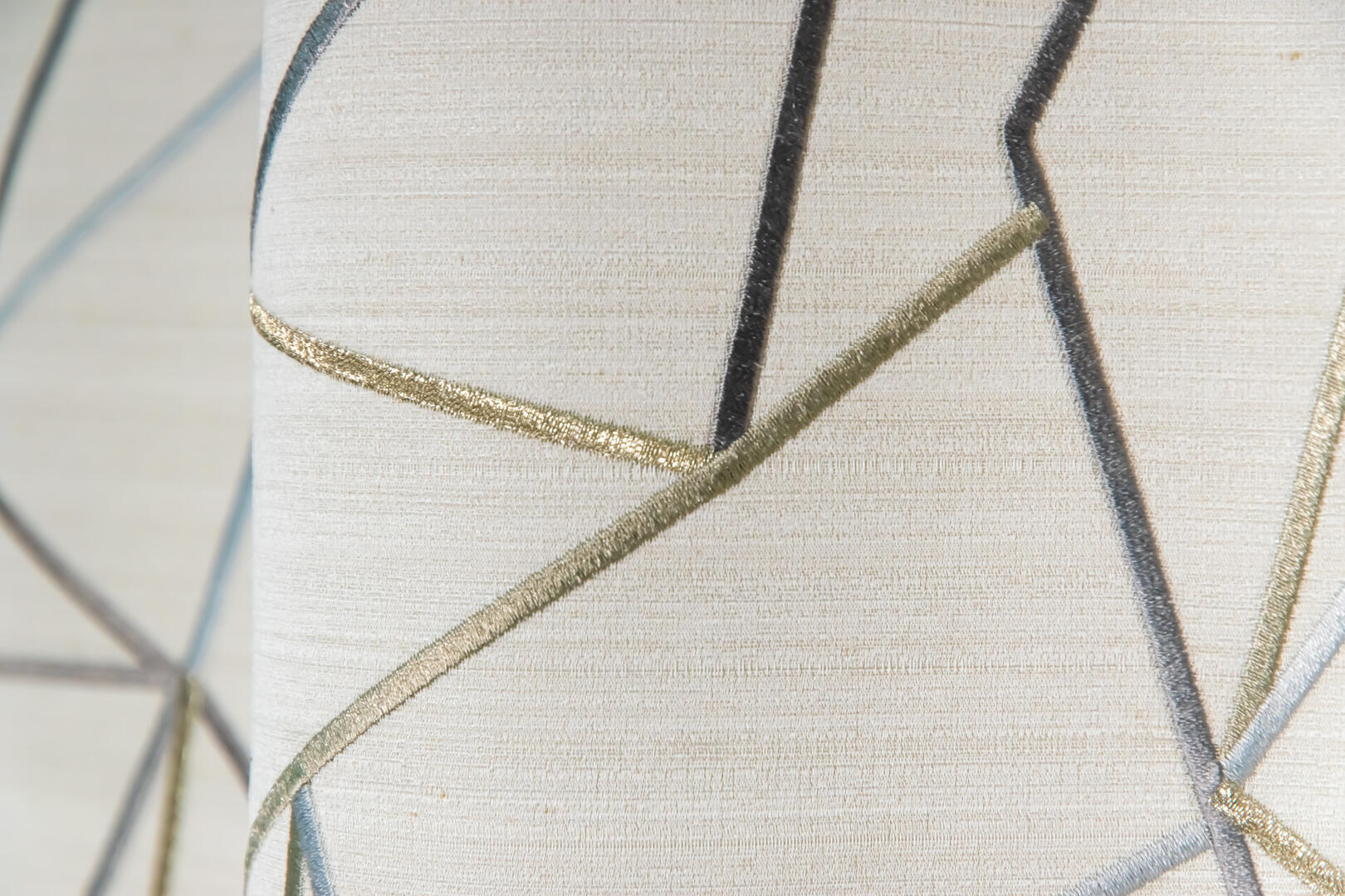 Dit bijzondere overgordijn kenmerkt zich door een verfijnd patroon van geometrische lijnen, geborduurd met diverse garens, waaronder glanzende en matte tinten, afgestemd op kleur. Het productieproces is intensief en tijdrovend, doordat de draden van het patroon met tal van naalden wordt ingestikt blijft deze stof geheel exclusief en uniek.
