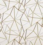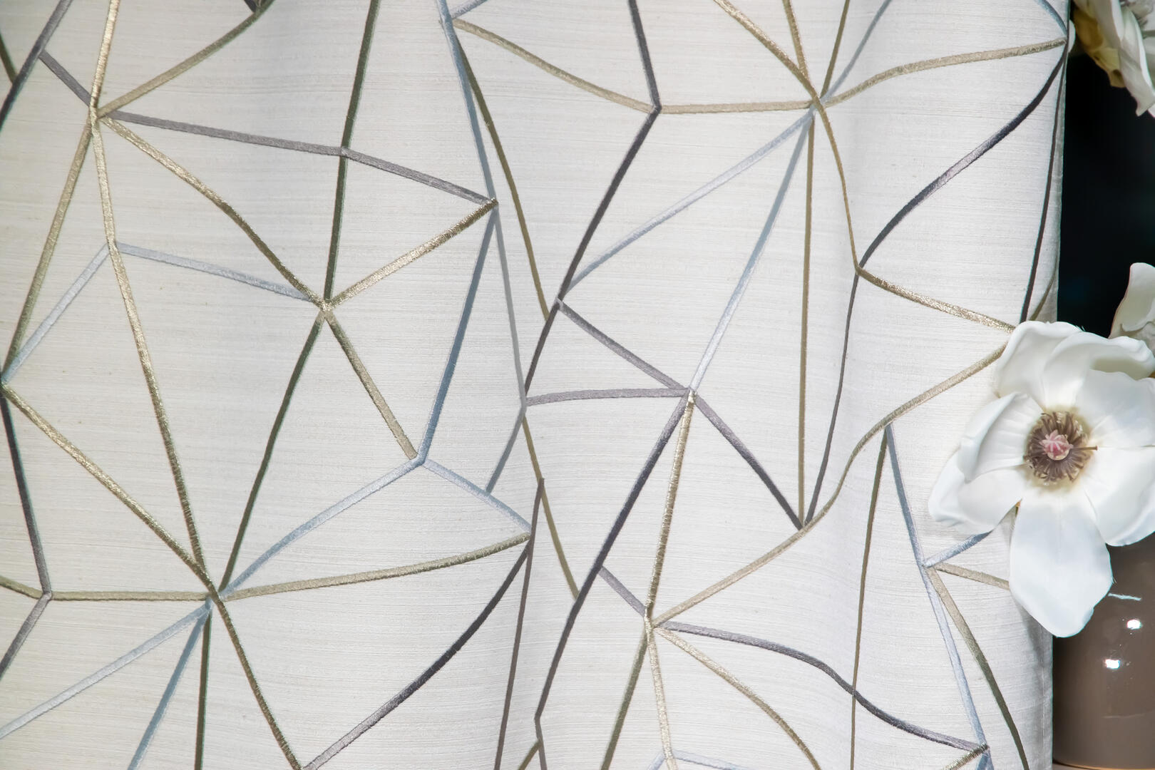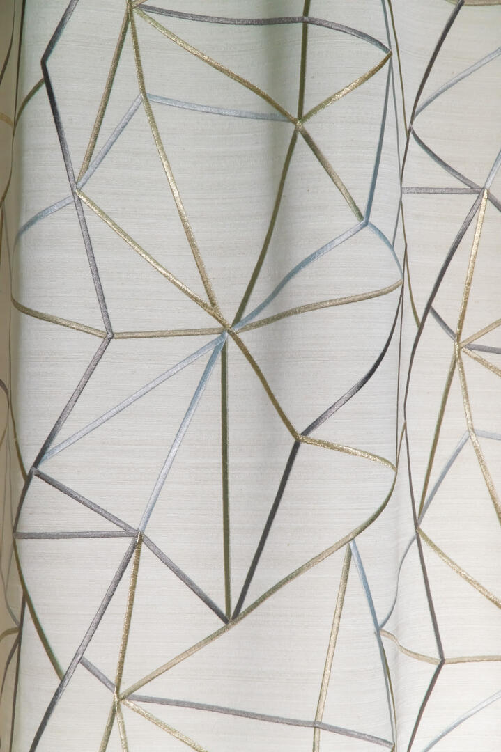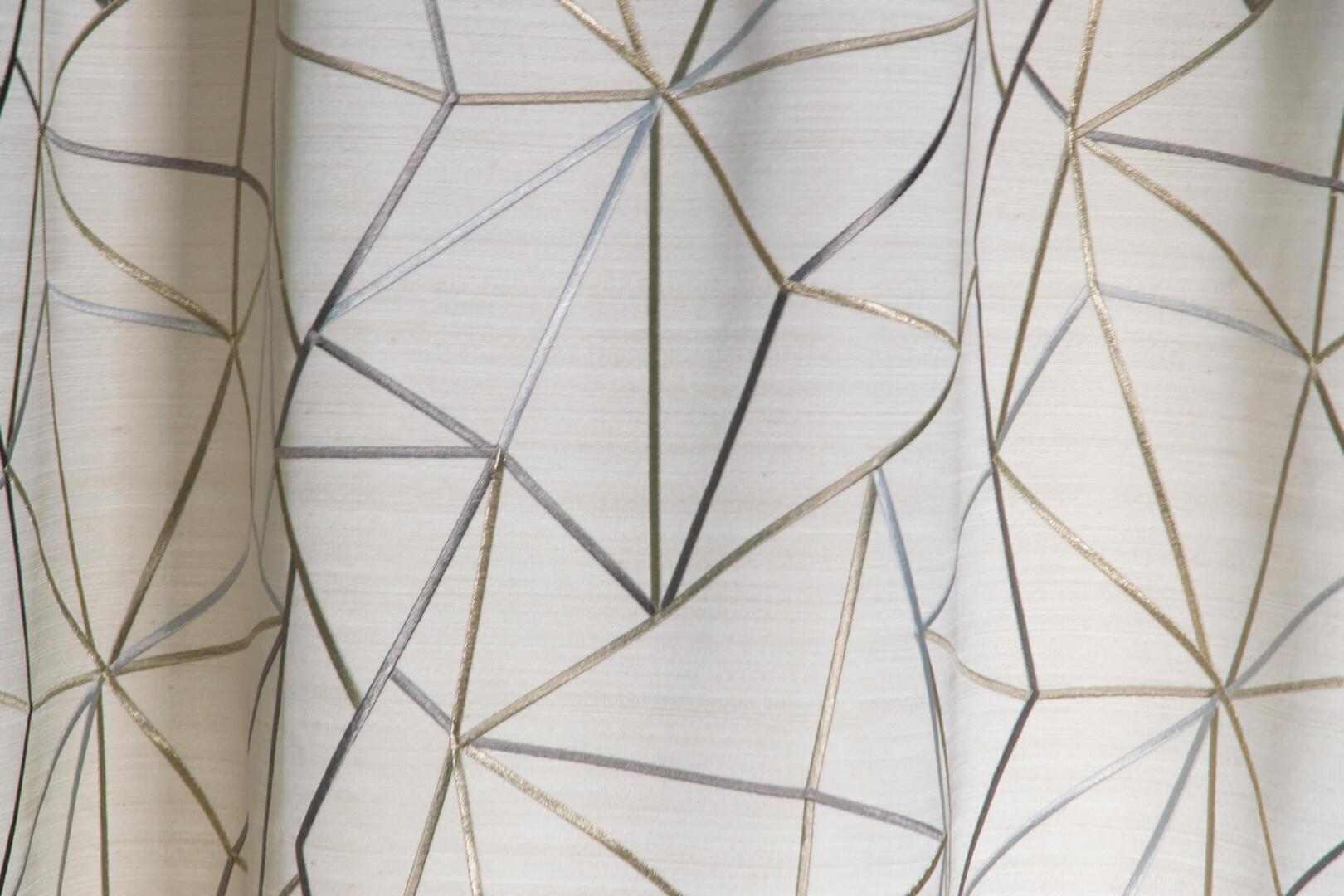Dit bijzondere overgordijn kenmerkt zich door een verfijnd patroon van geometrische lijnen, geborduurd met diverse garens, waaronder glanzende en matte tinten, afgestemd op kleur. Het productieproces is intensief en tijdrovend, doordat de draden van het patroon met tal van naalden wordt ingestikt blijft deze stof geheel exclusief en uniek.