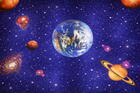 • Diep nachtblauw als basiskleur, met realistische sterren, planeten en ruimte-elementen.