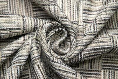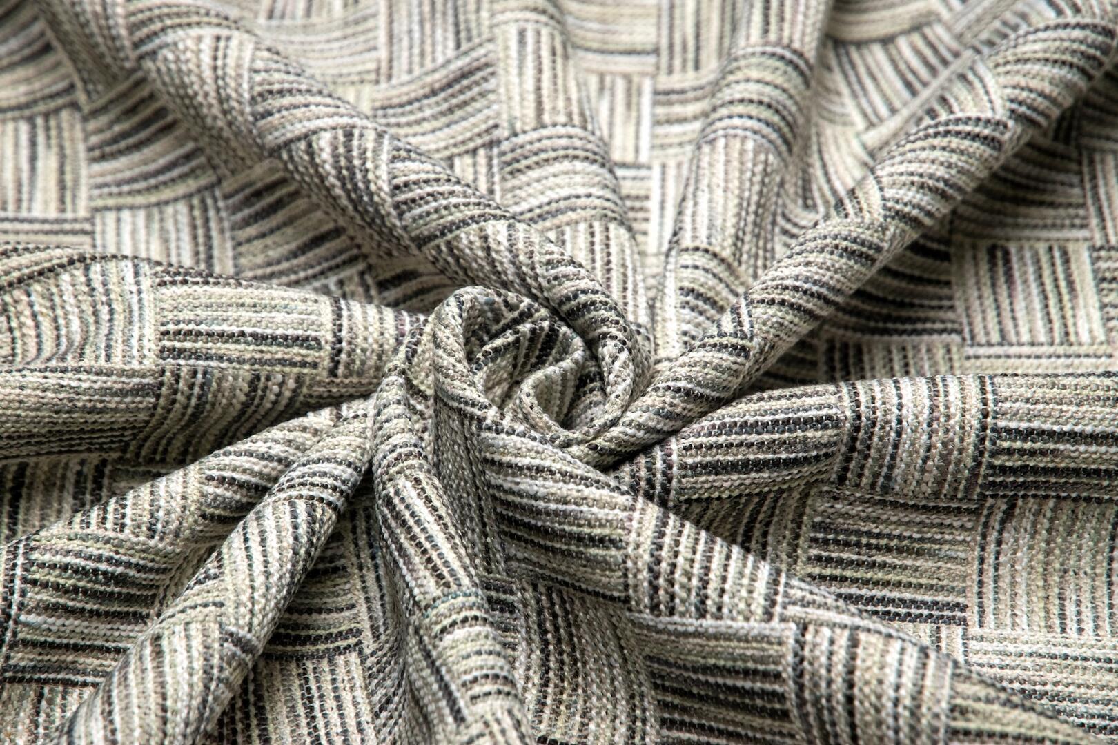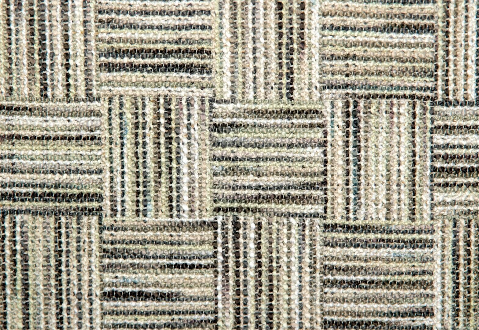Het motief van Habitat bestaat uit een herhalend blokpatroon waarin horizontale en verticale lijnen elkaar afwisselen. Elk blok heeft zijn eigen richting, waardoor een subtiel ritme ontstaat dat levendig oogt maar niet onrustig wordt. De structuur is duidelijk voelbaar: grove inslagdraden worden gecombineerd met fijnere garens, wat zorgt voor diepte en een ambachtelijke uitstraling. De licht onregelmatige draadspanning geeft de stof karakter en laat het weefsel zichtbaar spreken.