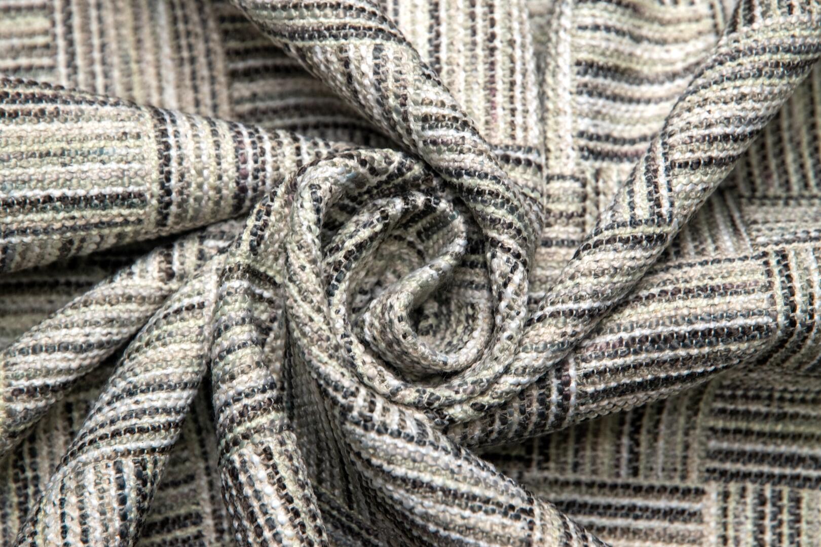 Koele grijstinten met taupe en een lichte zilvertoon. Ingetogen en tijdloos, met het weefpatroon duidelijk zichtbaar.