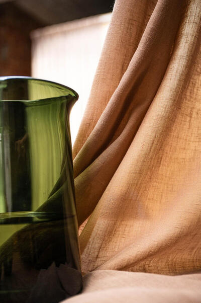 Immersion is een sfeervol in-between gordijn dat opvalt door zijn natuurlijke en rustige uitstraling. De stof valt soepel en laat het daglicht op een subtiele manier door. Hierdoor ontstaat een zachte lichtfiltering die een fijne balans geeft tussen privacy en openheid. Op de afbeelding is te zien hoe de stof een fijn geweven structuur heeft met lichte en donkere nuances die prachtig in elkaar overlopen. De kleur toont zich als een warme, lichte bruintint met een zacht beige ondertoon. Door het doorvallende licht worden er subtiele variaties zichtbaar: hier en daar zie je bijna goudachtige schakeringen, terwijl andere delen juist wat koeler beige ogen. Dit levendige spel ontstaat doordat het licht door de vezels heen wordt gefilterd en zo voor diepte in de stof zorgt. Het motief zelf is rustig en bestaat uit een verticale, licht onregelmatige weving die de stof een natuurlijke uitstraling geeft zonder druk te worden. Flow, de stof waarop Immersion gebaseerd is, voelt zacht aan en valt soepel. De lichte structuur zorgt ervoor dat het gordijn prettig aanvoelt en vriendelijk oogt in vrijwel iedere woonstijl. Dankzij het brede kleurenpalet is er altijd een variant die aansluit bij jouw interieur.