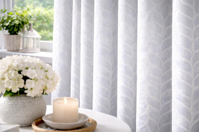 Het gordijn Luminelle kenmerkt zich door een verfijnd, golvend patroon dat doet denken aan overlappende bladeren. Het motief loopt verticaal over de stof en volgt de plooien van het gordijn op een natuurlijke manier, waardoor er een rustig ritme ontstaat in het interieur. De licht verhoogde lijnen in het dessin zorgen voor een tastbare structuur en geven de stof een levendig karakter wanneer het licht erop valt.