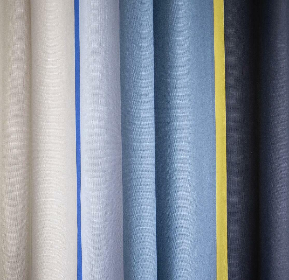 De verdeling van de strepen is gebalanceerd en herhalend, waardoor het gordijn een strak en rustig beeld behoudt, ook wanneer het in plooien hangt. Door de valling van de stof ontstaan natuurlijke schaduwen die het patroon extra diepte geven.