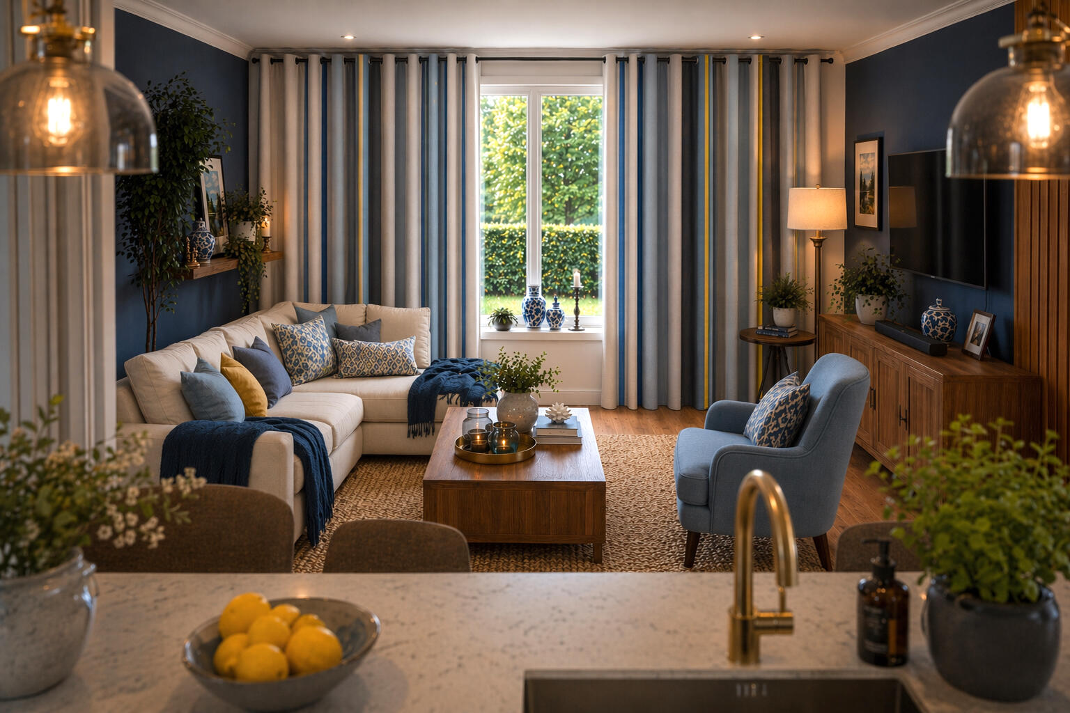 Het dessin bestaat uit een verfijnd samenspel van verticale banen in verschillende breedtes. Zachte zandtinten worden afgewisseld met koel lichtblauw en diepe antraciet- en donkerblauwe accenten. Tussen deze rustige basiskleuren loopt een subtiele gele streep die het geheel net dat beetje extra contrast geeft zonder te overheersen.