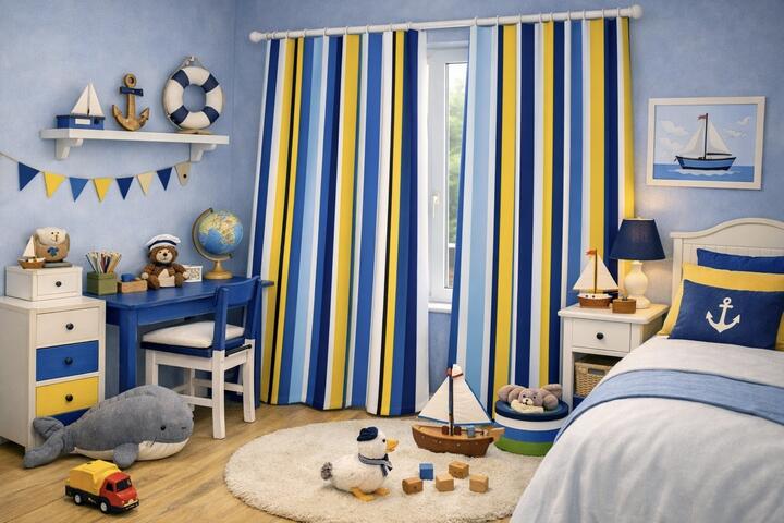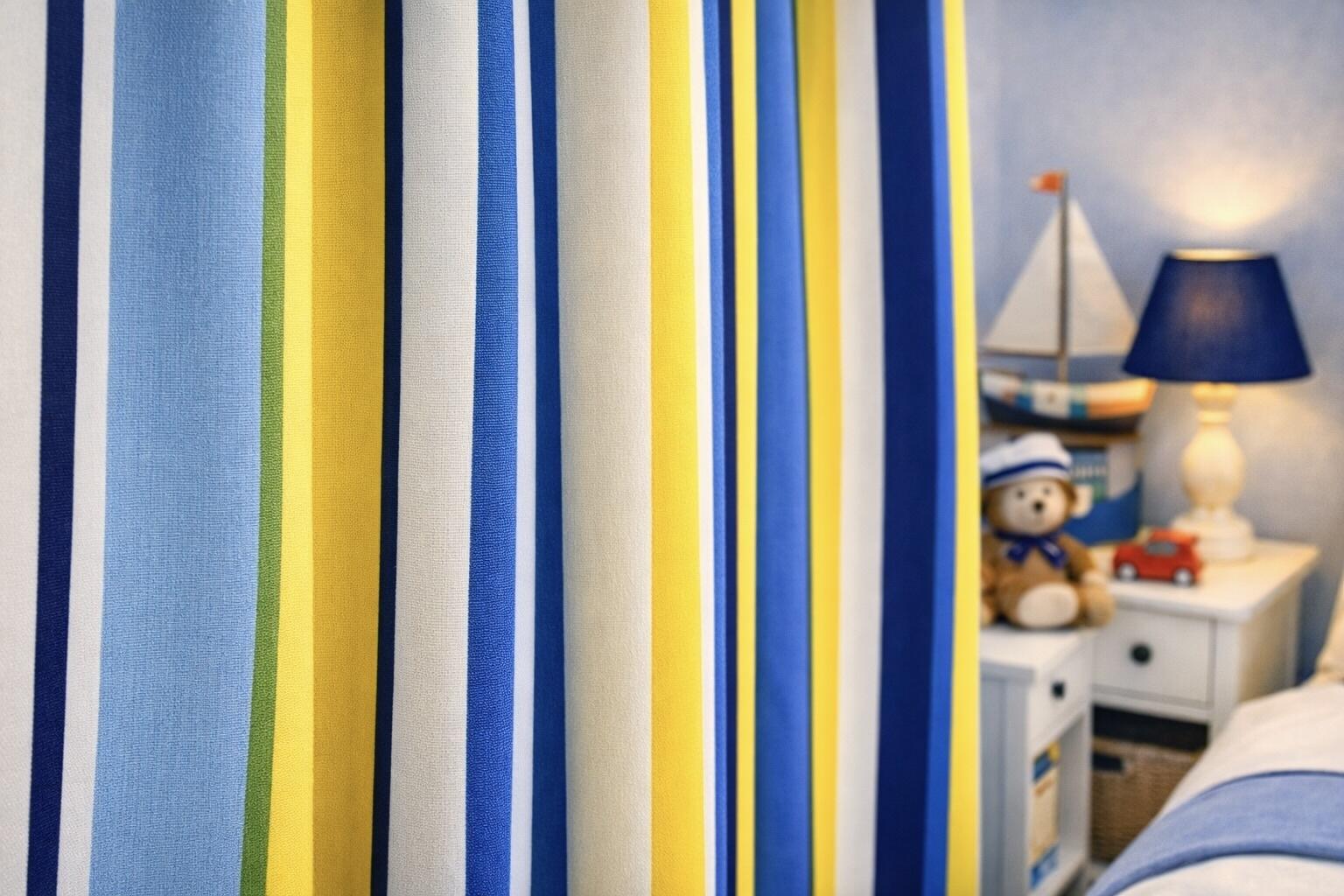 De Blue Mix combineert lichtblauw en marine met zachte roomtinten en frisse gele accenten. Deze samenstelling geeft een rustige, frisse uitstraling en past perfect in kinder- en tienerkamers waar licht en helderheid gewenst zijn.