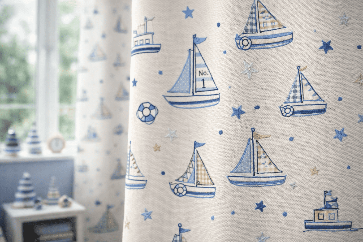Het gordijn Happy Boy brengt een vrolijk maritiem thema in de kinderkamer met een patroon vol zeilboten, reddingsboeien, sterretjes en kleine vlaggetjes die speels over de stof zijn verdeeld. Op de foto’s zie je hoe elk bootje niet alleen is geborduurd, maar ook is opgebouwd uit echte, ingenaaide printstofjes: ruitjes, stippen en fijne weefsels vormen samen de zeilen, terwijl de rompen en details met een stevige borduursteek zijn omlijnd. Dat geeft een voelbare diepte en een ambachtelijke uitstraling die je direct ziet én voelt wanneer je de stof in handen hebt.