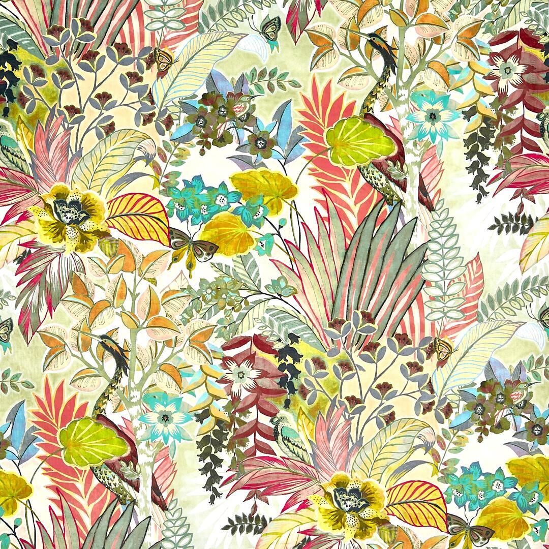 Het gordijn Hidden Paradise is een zijdezachte velours stof die een bijzonder zachte textuur biedt. Het motief is haarscherp en met uiterste precisie op de stof aangebracht, waardoor elk detail tot leven komt. Het patroon is groot en imposant, met een patroon van maar liefst 142 cm, waardoor je bij langere blik steeds meer verborgen details zult ontdekken. Het ontwerp toont een rijk landschap vol weelderige flora en fauna, met grote bladeren en bloemen die zich over de stof uitspreiden, en binnen het patroon zijn subtiele dieren verscholen. Zo zijn er onder andere een verschillende tropische vogels waaronder een scene met twee kleurrijke vogels die gefascineerd naar elkaar kijken, evenals  vlinders en een aparte sprite die zich tussen de bladeren verbergt. Hoe langer je er naar kijkt, des te meer verrassingen je meent te zien. De stof is in vier kleuren verkrijgbaar: een licht ecru zoals op de sfeerfoto, een warme bronskleurige tint, een patrol-variant en een diep blauwe uitvoering. Wil je eerst de textuur en kleur van de stof voelen en zien voordat je een maatwerk gordijn bestelt? Bestel dan een knipstaal. Deze worden meestal dezelfde dag nog verzonden, zodat je zonder haast kunt bepalen of deze stof past bij jouw interieur. Voor extra comfort en optimale isolatie tijdens het gebruik kun je tijdens het bestelproces kiezen voor een voering.