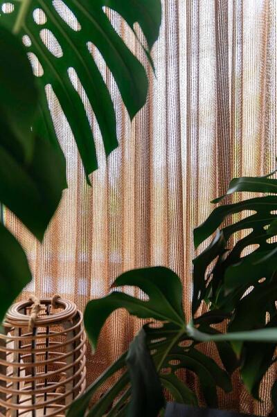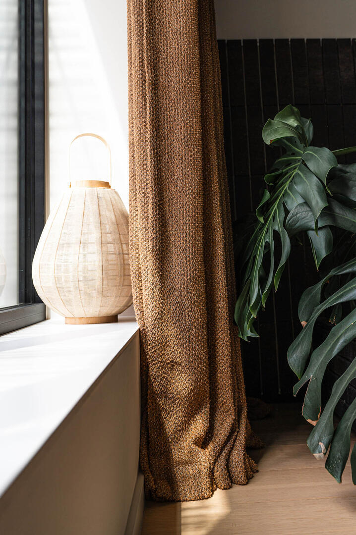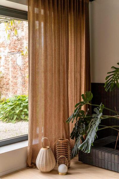 Ervaar de unieke nuances van het Riad in-between gordijn, een stoffering die zich perfect leent als zowel in-between als overgordijn, met name wanneer gecombineerd met een voeringstof. De Riad stof straalt een ambachtelijke charme uit, te danken aan de bijzondere samenstelling van het materiaal. Het ontwerp bestaat uit een mesh-achtige structuur die zijn karakter ontleent aan het gebruik van twee gespecialiseerde kettingdraden. Wat dit gordijn bijzonder maakt, is de combinatie van harige garens die een weelderig volume toevoegen, en getwiste garens in diverse tinten die de diepte van de stof benadrukken. Deze samensmelting van elementen introduceert een gewaagde dimensie in elk interieur, waardoor het Riad gordijn echt opvalt. Het motief is een mengelmoes van aardetinten, waarbij bruine en gouden schakeringen elkaar afwisselen en zo een warme maar dynamische uitstraling geven. De veelkleurigheid van het garen zorgt voor een speelse, levendige toets die prachtig contrasteert met iedere ruimte.