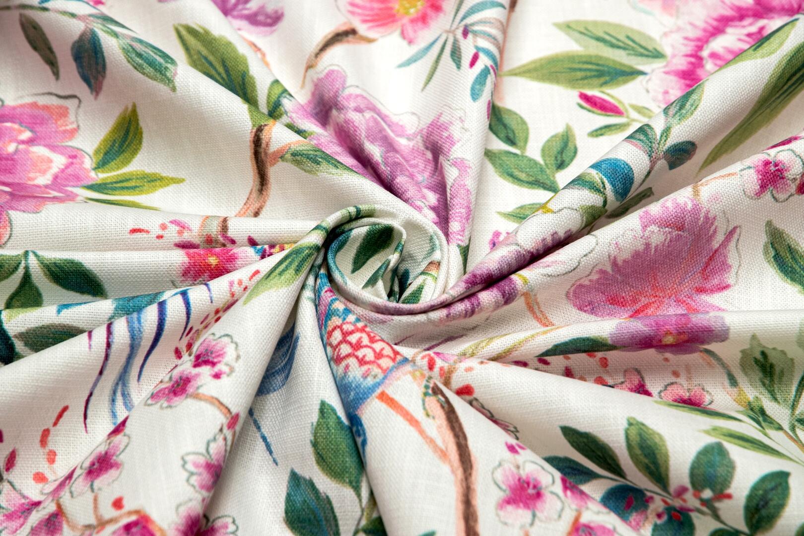 Op de lichte ondergrond ontvouwt zich een rijk botanisch tafereel. Grote bloemen in tinten roze, oudroze en magenta vormen het hart van het dessin. Tussen deze bloemen groeien fijne takjes met kleine bloesems in zachtroze en lichtrood, aangevuld met fris groen blad in verschillende tinten – van zacht saliegroen tot dieper bosgroen. Tussen de bloemen zitten twee sierlijke vogels. De eerste vogel heeft een opvallend verenkleed met blauw, turquoise, warm oranje en zacht geel, gecombineerd met een lange sierlijke staart met rode en blauwe accenten. De tweede vogel is speelser gepositioneerd op een tak en heeft een lichaam met lichtblauwe en turquoise tinten, een subtiel roze patroon op de vleugel en een lange bordeauxrode staart.