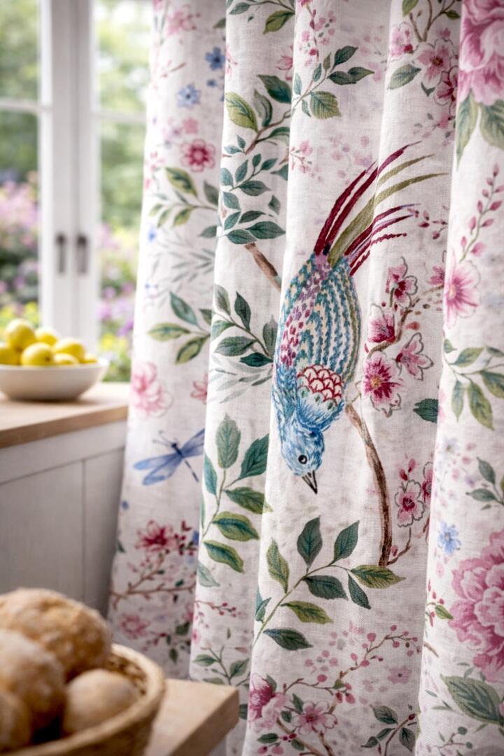 Met het Songbird Garden gordijn breng je een levendig tuinmotief in huis. Het ontwerp toont sierlijke takken met weelderige bloemen, speelse bladeren en twee opvallende zangvogels die tussen het bloeiende groen zijn afgebeeld. Het patroon heeft een natuurlijke, schilderachtige uitstraling waardoor het gordijn perfect past in een woonkeuken, woonkamer of slaapkamer waar een warm en huiselijk karakter gewenst is.