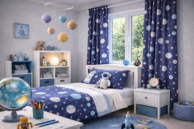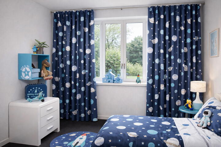 Het gordijn Space Mission brengt de wondere wereld van het heelal rechtstreeks de kinderkamer in. Op de dikke, donkerblauwe stof schitteren planeten in verschillende tinten lichtblauw en grijs, alsof ze zweven in de nachtelijke ruimte. Tussen de planeten fonkelen kleine witte sterren die het geheel een speels en ruimtelijk effect geven. Wat dit gordijn extra leuk maakt, zijn de namen die op de planeten staan: Jupiter, Mars, Venus, Saturnus en Moon – perfect voor kleine ruimtevaarders die alles willen weten over het zonnestelsel. De print is helder, fantasierijk en ideaal voor kinderen die dromen van raketten, astronauten en verre planeten. De stof is van uitstekende kwaliteit: stevig, soepel en prettig aanvoelend. Ze hangt mooi en blijft lang goed, zelfs bij dagelijks gebruik. De diepe blauwe kleur zorgt bovendien voor een rustgevend effect in de kamer, waardoor het gordijn niet alleen mooi is om naar te kijken, maar ook functioneel voor een fijne nachtrust. Tijdens het bestelproces kun je de optie “Voering” aanvinken voor extra isolatie en verduistering.