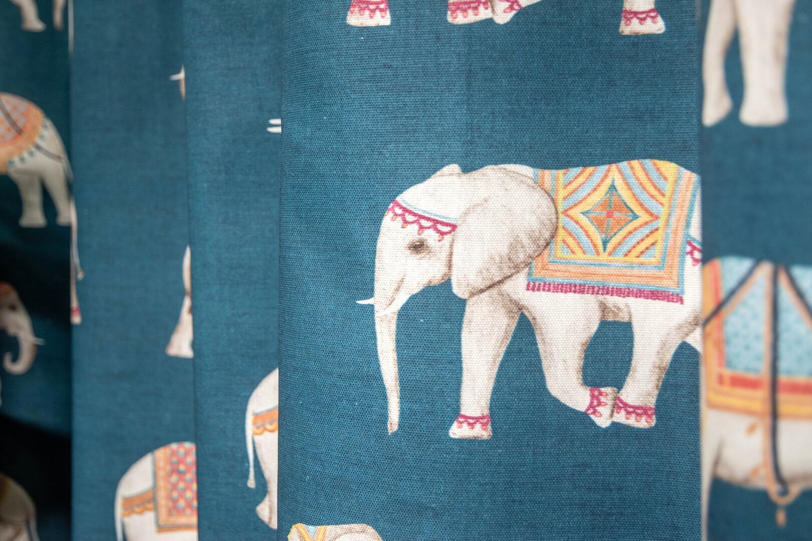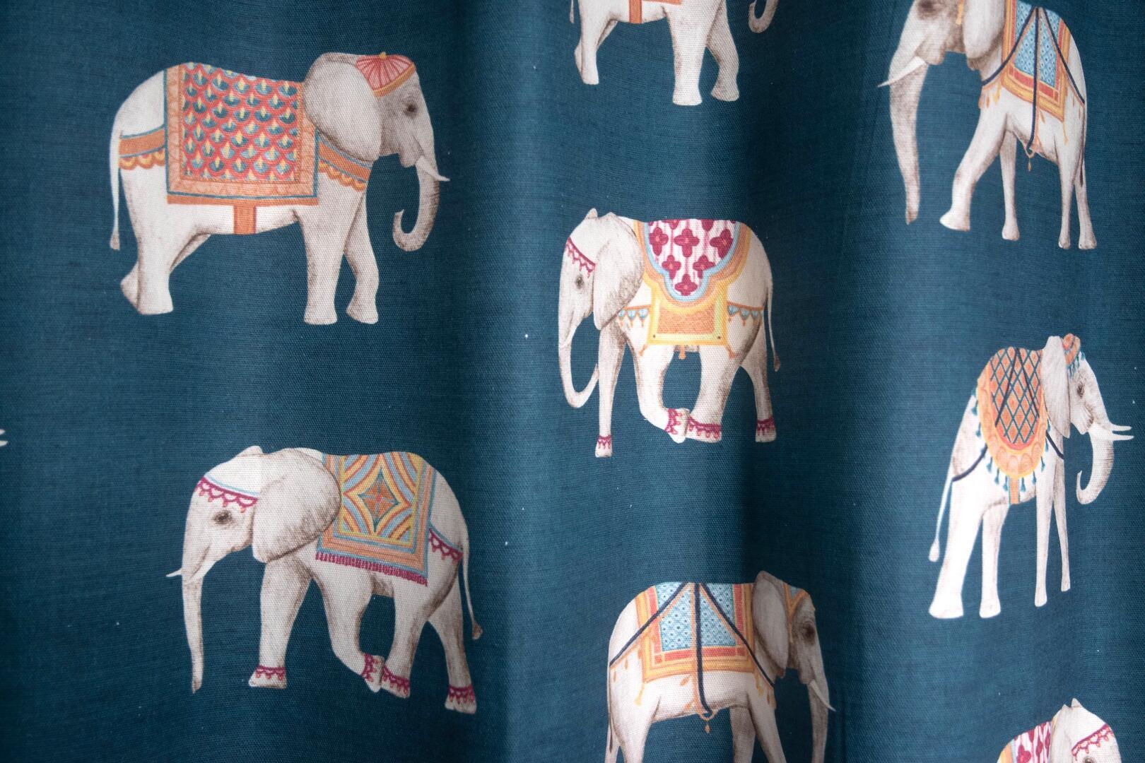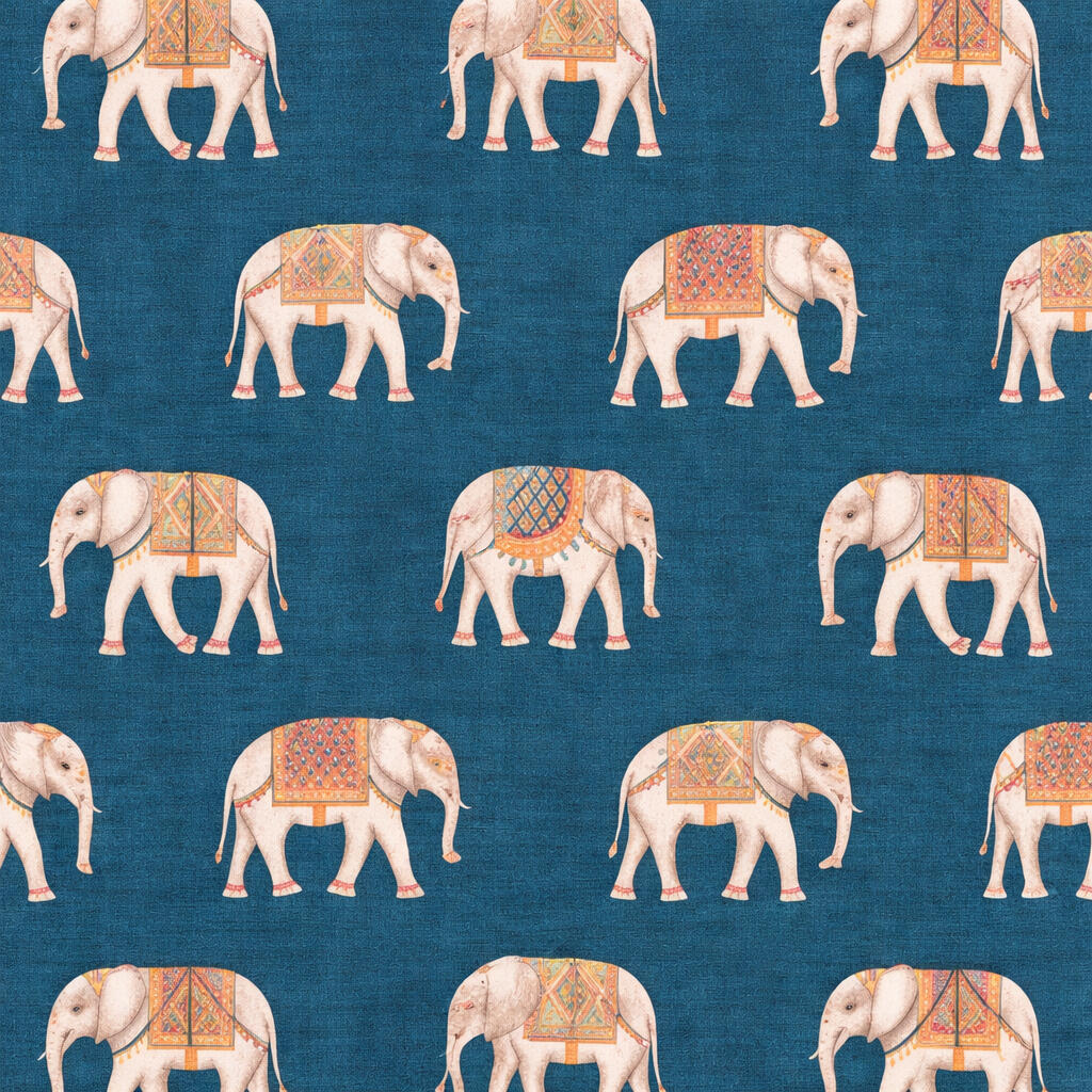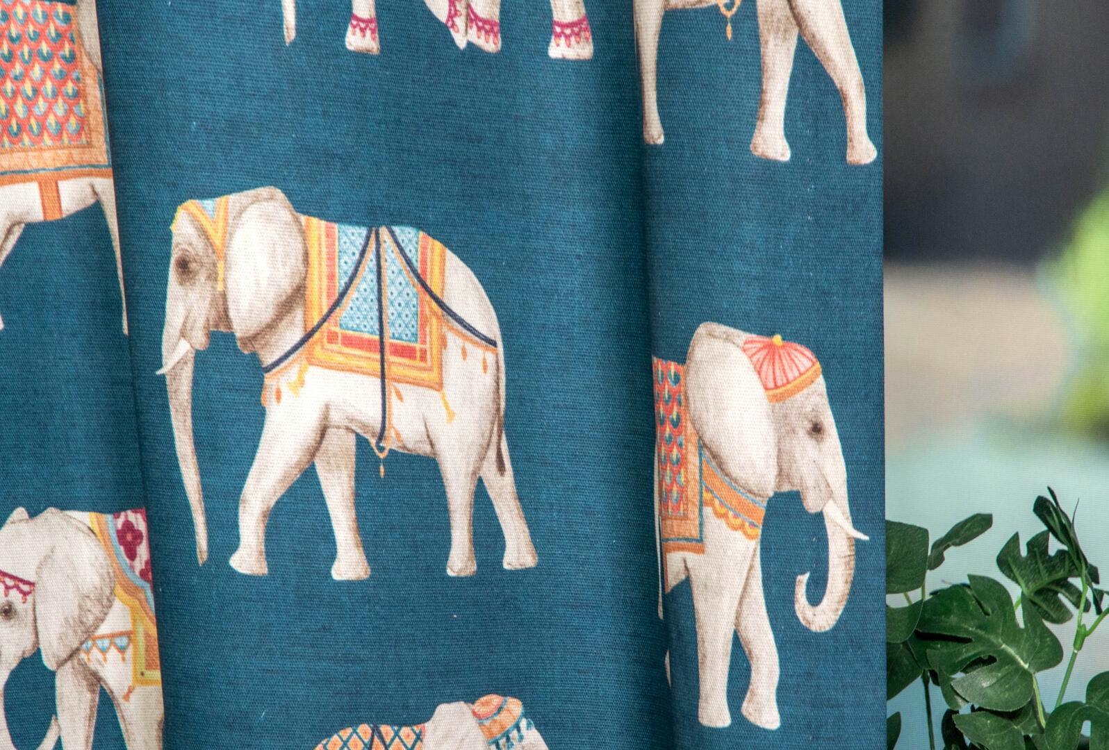 De diepe teal ondergrond vormt een krachtig contrast met de sierlijke olifanten die over de stof zijn verdeeld. Elke olifant is zorgvuldig uitgewerkt met decoratieve kleden in warme tinten zoals oker, terracotta, goud en accenten van turquoise en rood. De patronen op de kleden variëren subtiel, wat zorgt voor een speels en levendig geheel zonder onrustig te worden.
