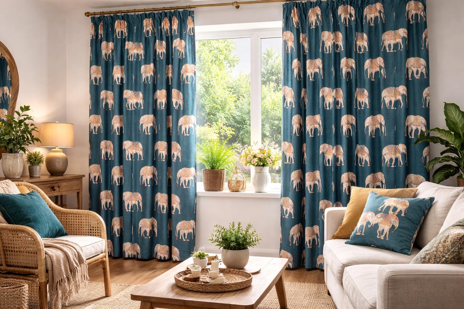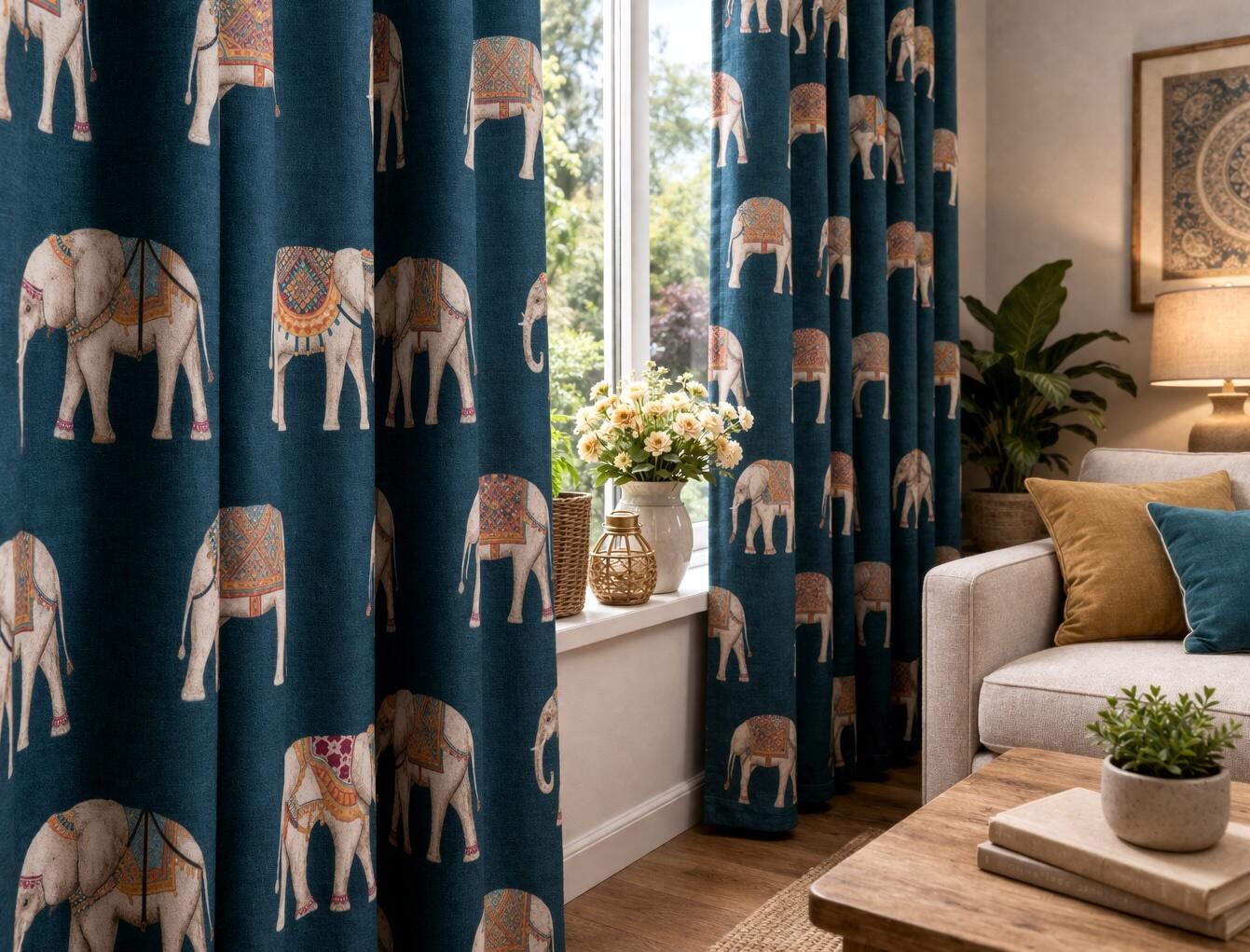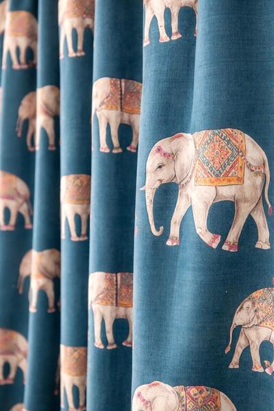 Taj Teal is geschikt voor verschillende woonstijlen, van warm en sfeervol tot meer uitgesproken en karaktervol. Het dessin komt extra mooi tot zijn recht wanneer de gordijnen rijk geplooid hangen en recht naar beneden vallen.