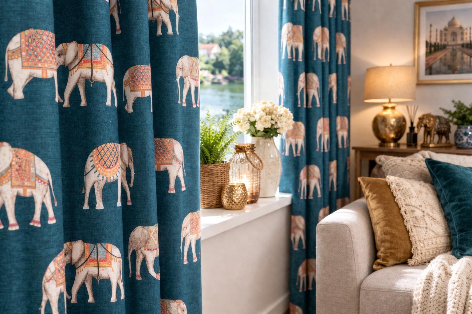 Taj Teal is een opvallend gordijn met een rijk en levendig motief dat direct de aandacht trekt.