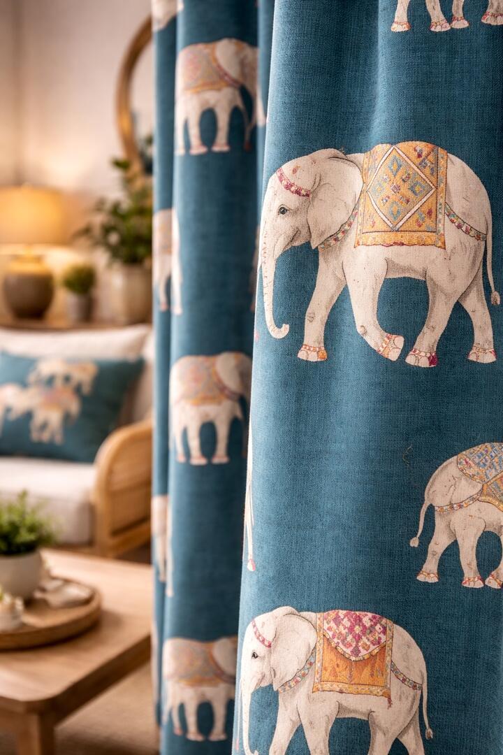 De herhaling van het motief is mooi in balans: de olifanten staan verspreid over de stof met voldoende ruimte ertussen, waardoor het dessin goed tot zijn recht komt, zowel in kleine als grote gordijnpartijen. Door de rijke kleur van de achtergrond krijgt het geheel een warme, volle uitstraling die goed combineert met natuurlijke materialen zoals hout, rotan en zachte stoffen.