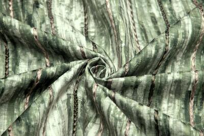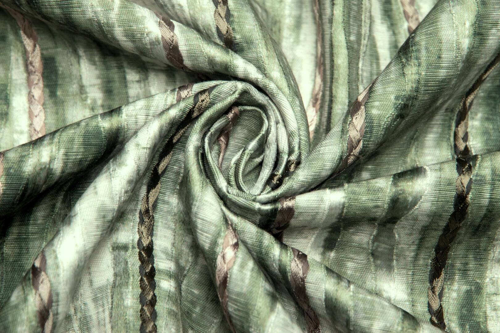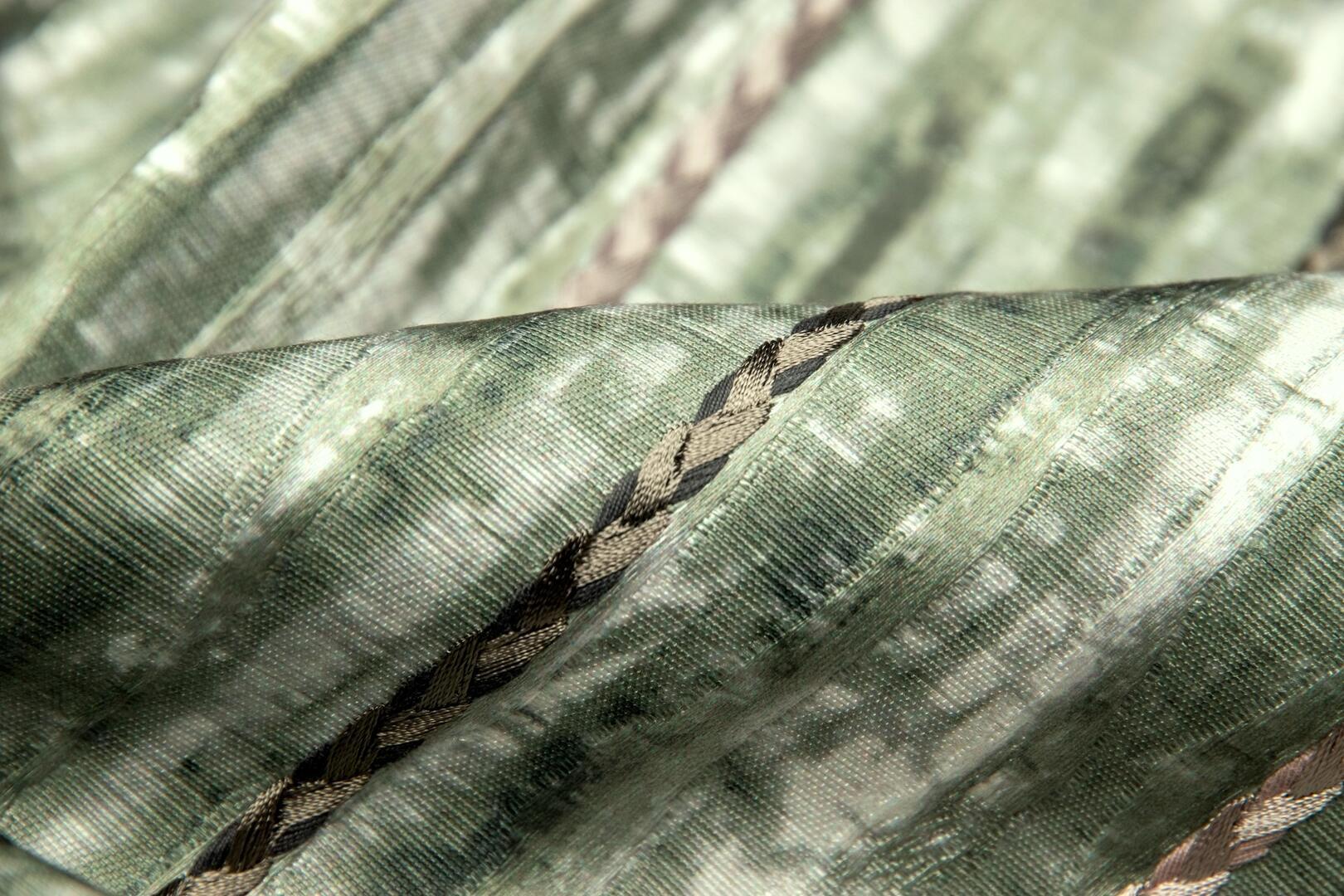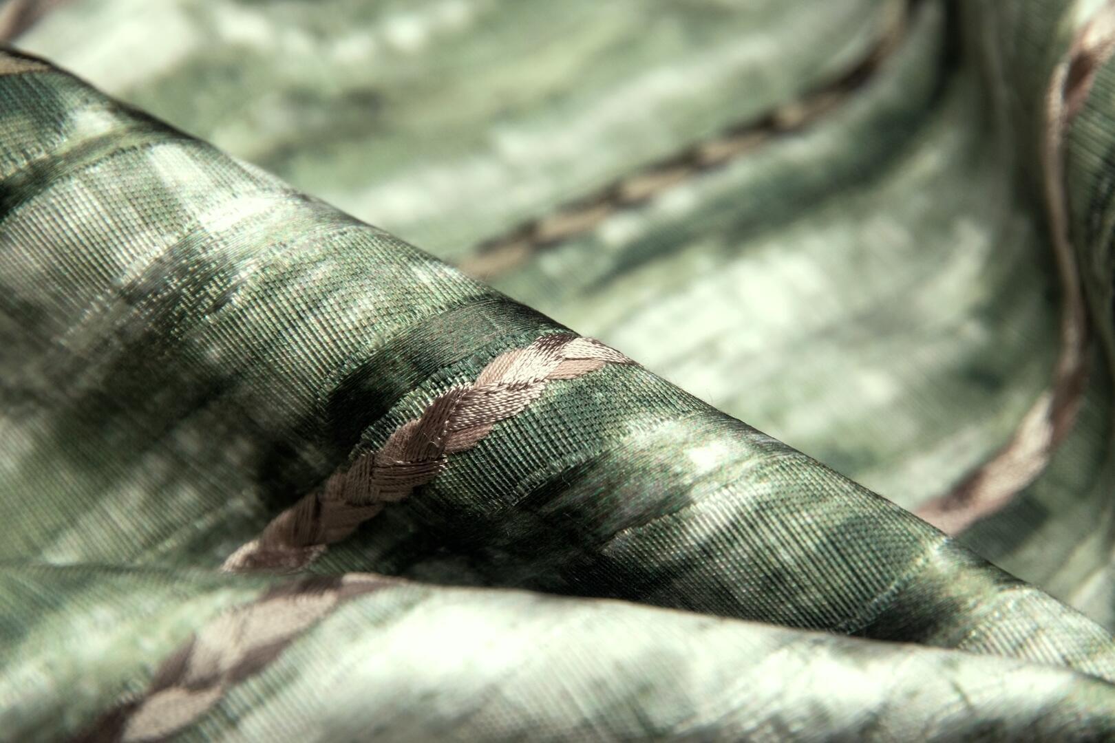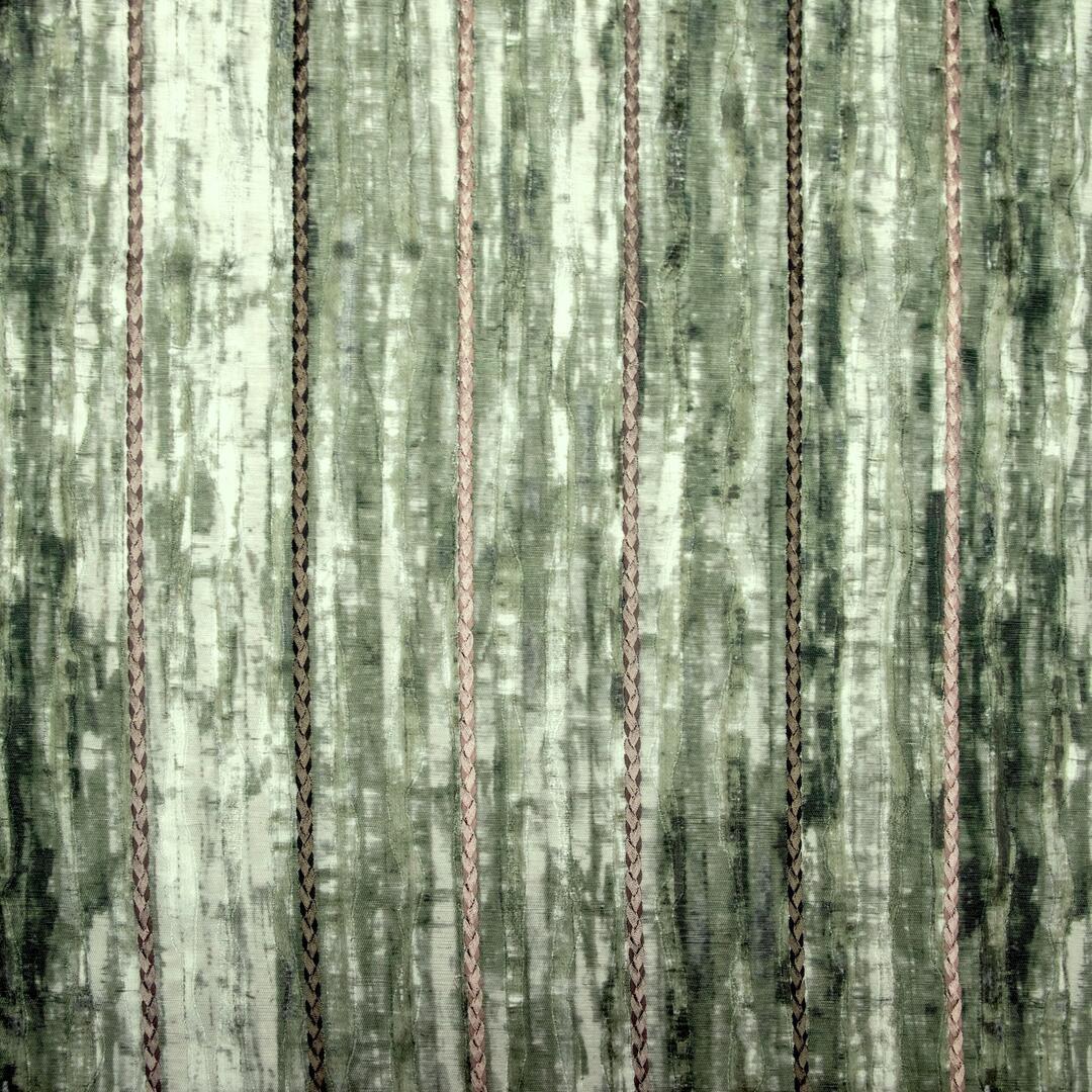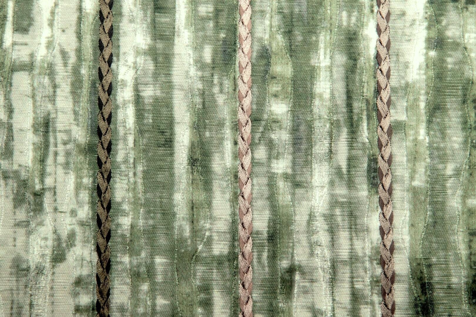 Trenzado is een gordijnstof met een uitgesproken karakter, waarin ambacht en detail centraal staan. Het meest in het oog springende element is het gevlochten borduursel dat zich in smalle banen over de stof herhaalt. Deze gevlochten lijnen lopen verticaal en vormen samen een ritmisch patroon dat direct diepte en gelaagdheid toevoegt aan het gordijn.
