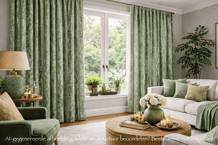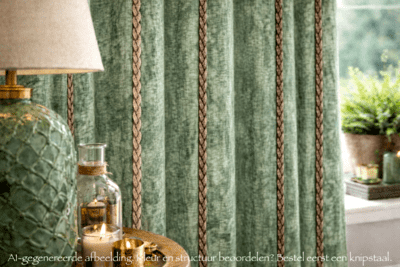 De sfeerfoto’s bij dit product zijn middels AI gegenereerd en dienen ter inspiratie. Alle overige afbeeldingen zijn echt gefotografeerd, zodat je het borduursel en het patroon zo realistisch mogelijk kunt bekijken. Wil je de stof eerst zelf zien en voelen voordat je een op maat gemaakt gordijn bestelt? Dan kun je eenvoudig een knipstaal aanvragen om de textuur en kleur te beoordelen. Staaltjes worden in de meeste gevallen dezelfde dag nog verzonden.