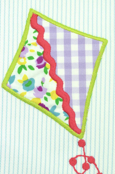 De vliegers zijn niet geprint, maar opgebouwd uit ingenaaide stukjes patroonstof die met een contrasterend stiksel zijn vastgezet. Hierdoor zijn de vormen licht verhoogd en voelbaar, wat het gordijn extra diepte geeft. Rondom elke vlieger loopt een gekleurde borduurlijn in tinten als rood, blauw, groen en roze, waardoor de vormen helder afsteken tegen de lichte achtergrond.