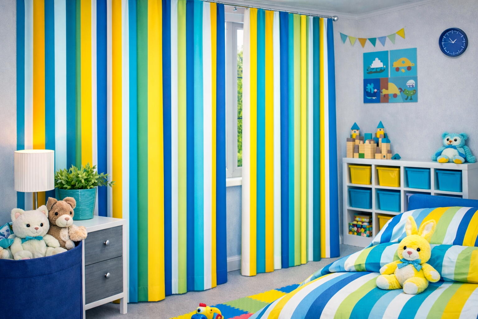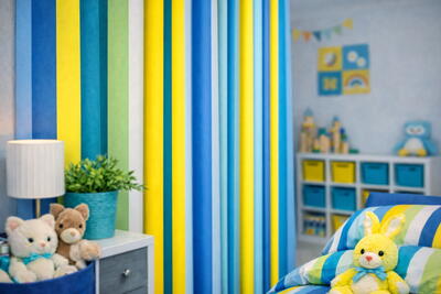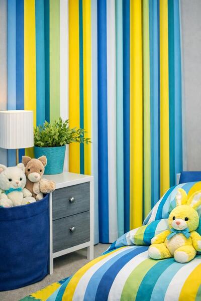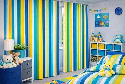 Deze exclusieve design-gordijnen combineren een speels, verticaal streeppatroon met een luxe stofkwaliteit. De afwisseling van frisse en warme tinten zorgt voor een levendig maar toch rustig geheel, waardoor de gordijnen prachtig tot hun recht komen in een kinder- of speelkamer, maar ook in een modern interieur.