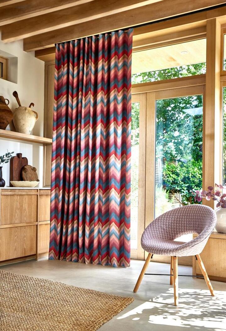 Het gordijn Zendaya met het zigzagmotief biedt een eigentijdse uitstraling en is een veelzijdige keuze voor verschillende interieurs. Het zigzagpatroon, dat al meerdere decennia populair is, krijgt hier de aandacht die het verdient door de fijne plooivalling die het gordijn krijgt. De stof, samengesteld uit 20% linnen en 80% katoen, voelt zacht en soepel aan en valt mooi in geplooide vormen, zoals te zien op de sfeerfoto. Het patroon bestaat uit rijen van shuttles in bijpassende kleuren die samen een levendig symmetrisch ontwerp vormen dat zeker tot de verbeelding spreekt. Deze gordijnen zijn verkrijgbaar in vijf kleuren: de kleur zoals op de sfeerfoto, een rustige zandkleur, een koele lichtblauw, terracotta en een uitvoering met groentinten.