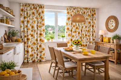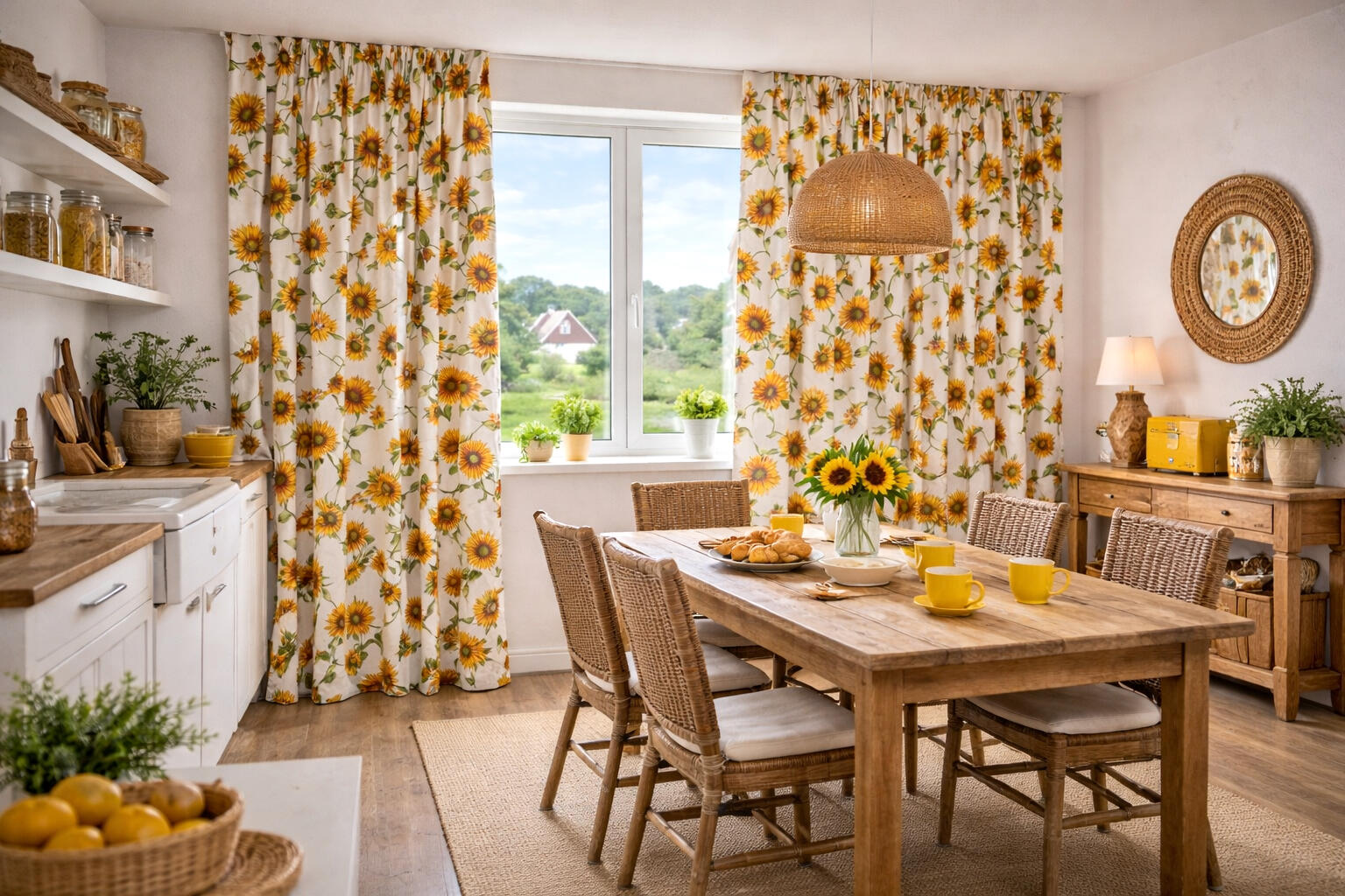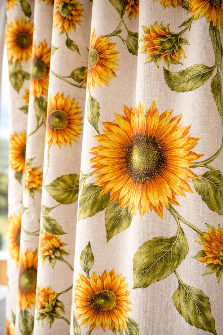 Het gordijn Zonova brengt een warme en levendige sfeer in huis dankzij het uitgesproken bloemmotief. Grote zonnebloemen zijn verspreid over de stof en trekken op een natuurlijke manier de aandacht. De bloemen zijn rijk uitgewerkt met volle bloemblaadjes in tinten geel, oker en zacht oranje, gecombineerd met diepe bruintinten in het hart. Tussen de bloemen zorgen groene bladeren en stelen voor balans en een speelse verdeling over het geheel.