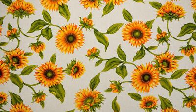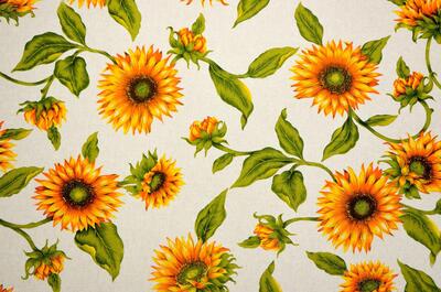 De achtergrond heeft een rustige, naturel uitstraling met een lichte ecru toon die doet denken aan ongebleekt katoen of canvas. Dit geeft het dessin een zachte basis waardoor de kleuren van de zonnebloemen mooi naar voren komen zonder te overheersen. Het patroon oogt levendig, maar blijft prettig in gebruik doordat de elementen op een natuurlijke manier over de stof zijn verdeeld.