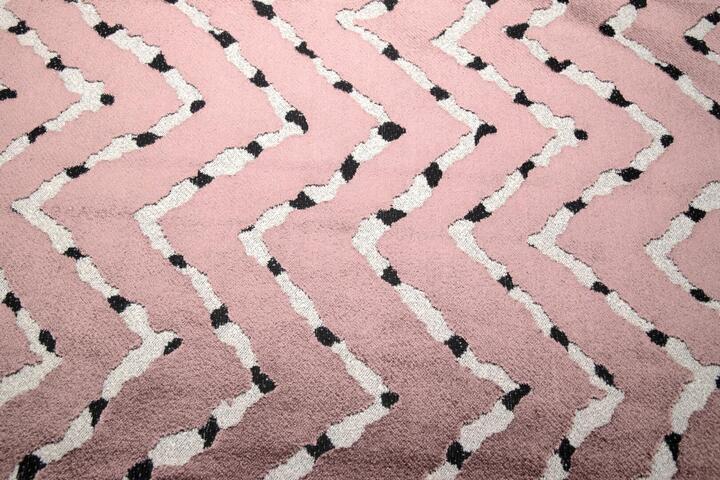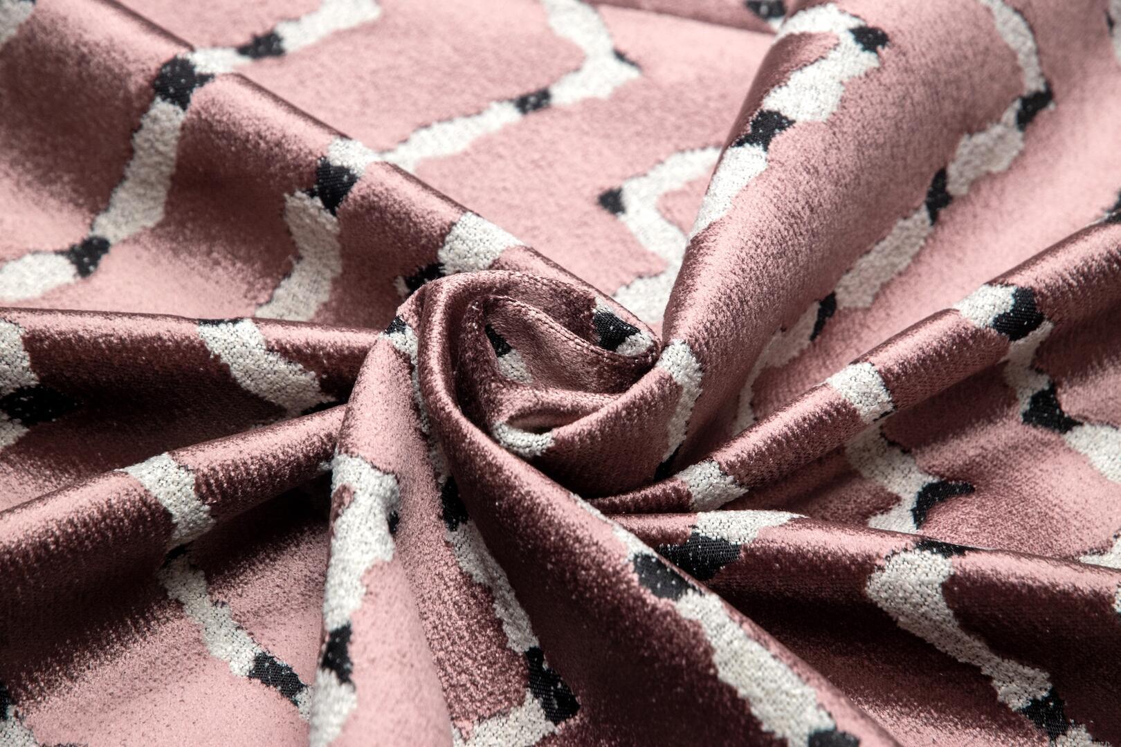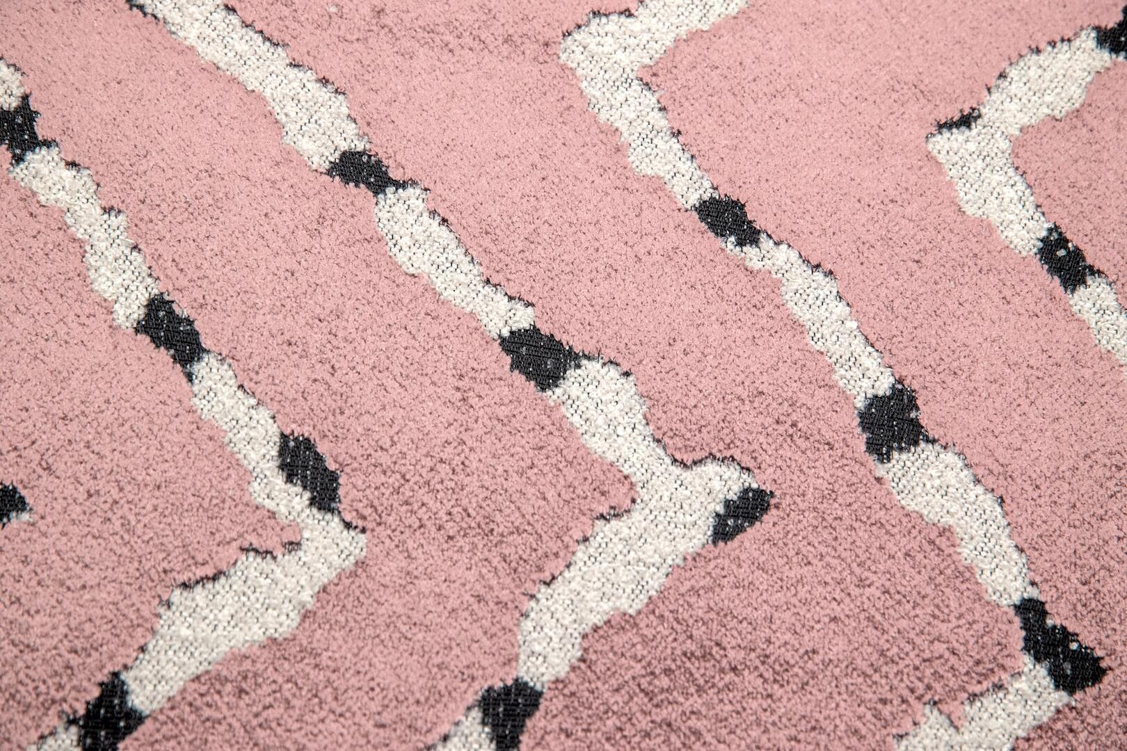 Een verfijnde roze ondergrond met een lichte poederachtige uitstraling. Het contrasterende lijnenspel springt subtiel naar voren en geeft het gordijn een speels maar gebalanceerd karakter. Deze variant voegt warmte toe zonder overheersend te zijn.