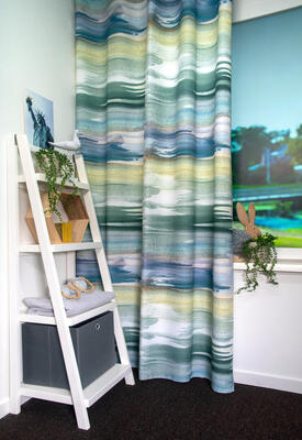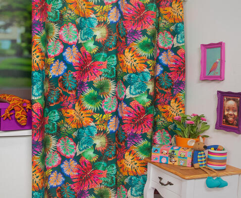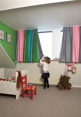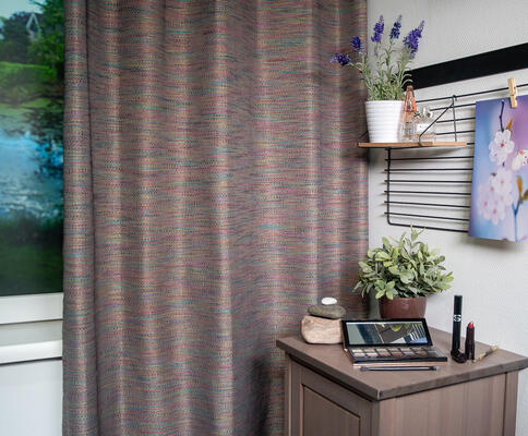 Solara is een uitgesproken gordijnstof die direct sfeer en energie toevoegt aan je interieur. Het motief bestaat uit krachtige verticale banen in een rijke mix van kleuren zoals warm rood, fel oranje, zonnig geel, diep paars, helder turquoise en subtiele accenten van wit en crème. De strepen variëren i...