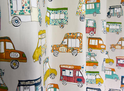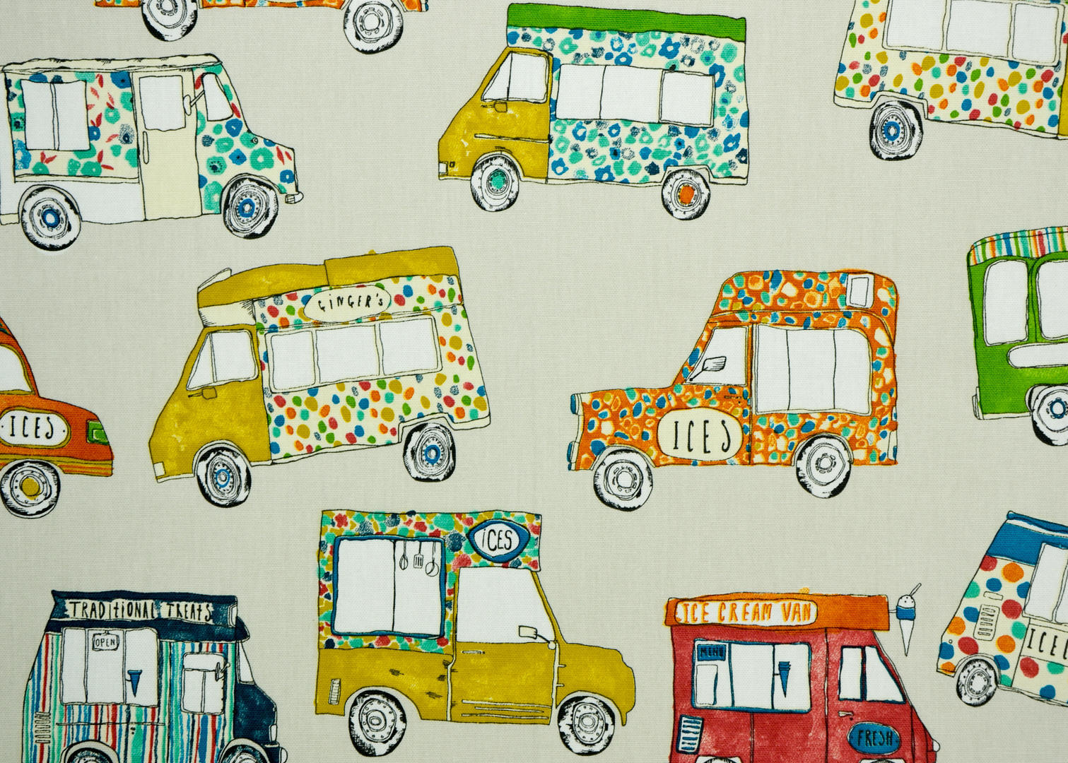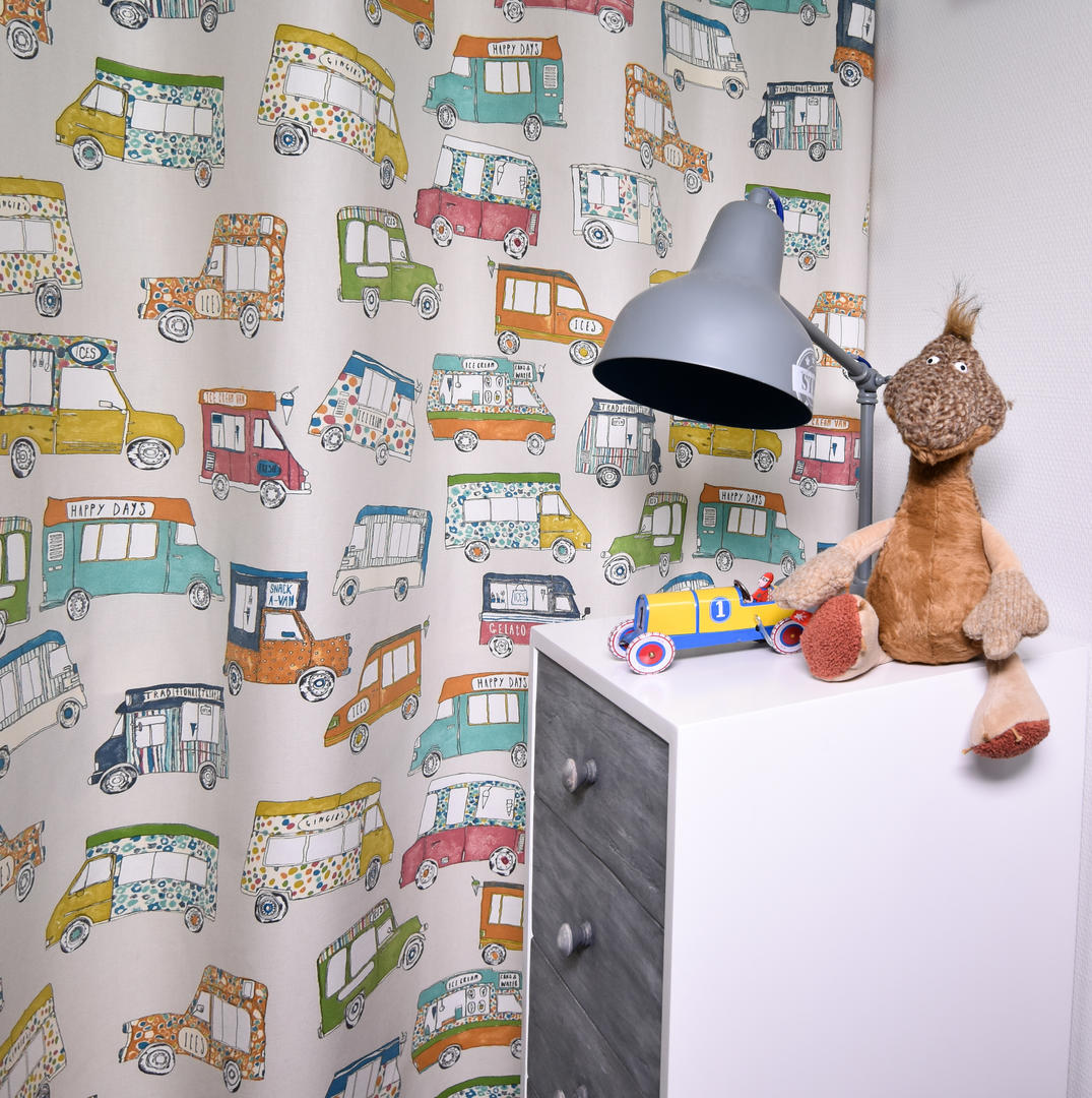 Een autootjes gordijn, maar niet zo maar auto’s: het zijn héérlijke klassieke ijscowagens! De bel klinkt, de ijscoman rijdt door de straat. Daar word je toch vrolijk van? De wagentjes zijn 10 cm groot en gedrukt op stevig geweven, matte katoen. De ondergrondkleur is fraai kiezelgrijs, de gebruikte tinten mooi poederig van kleur. Dat geeft nog even extra dat nostalgische effect. De wafelijsjes en hoorntjes zijn op jouw slaapkamer natuurlijk ‘ijskoude dé beste!’