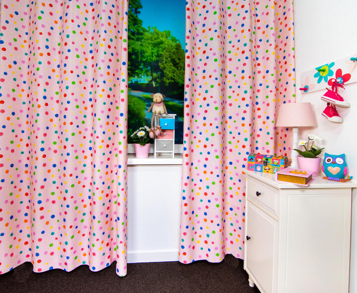 Deze gordijnstof met de naam Funky Dots is gemaakt van de beste materialen waardoor het gordijn mooi in de plooi valt.