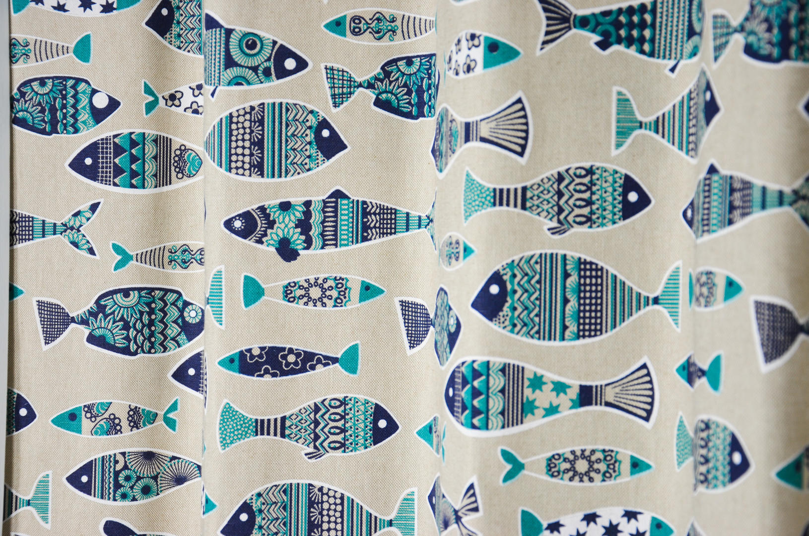 Deze gordijnstof met de naam Artful Fish is gemaakt van de beste materialen waardoor het gordijn mooi in de plooi valt.